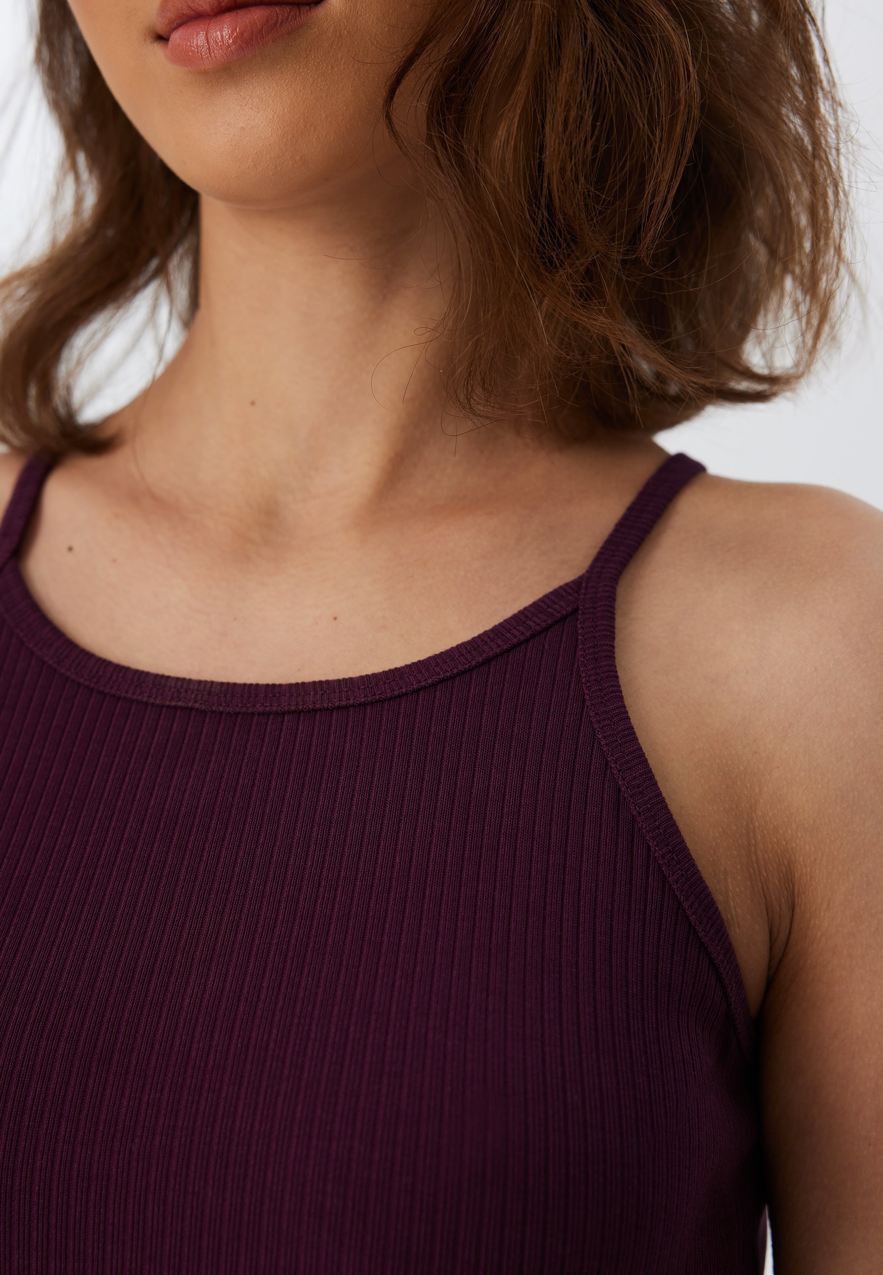 Damen Ripp-Crop-Top aus Ripp Jersey. Mit Spaghettiträgern und rundem Halsausschnitt. Weicher Baumwolljersey: 100% kbA-Baumwolle.