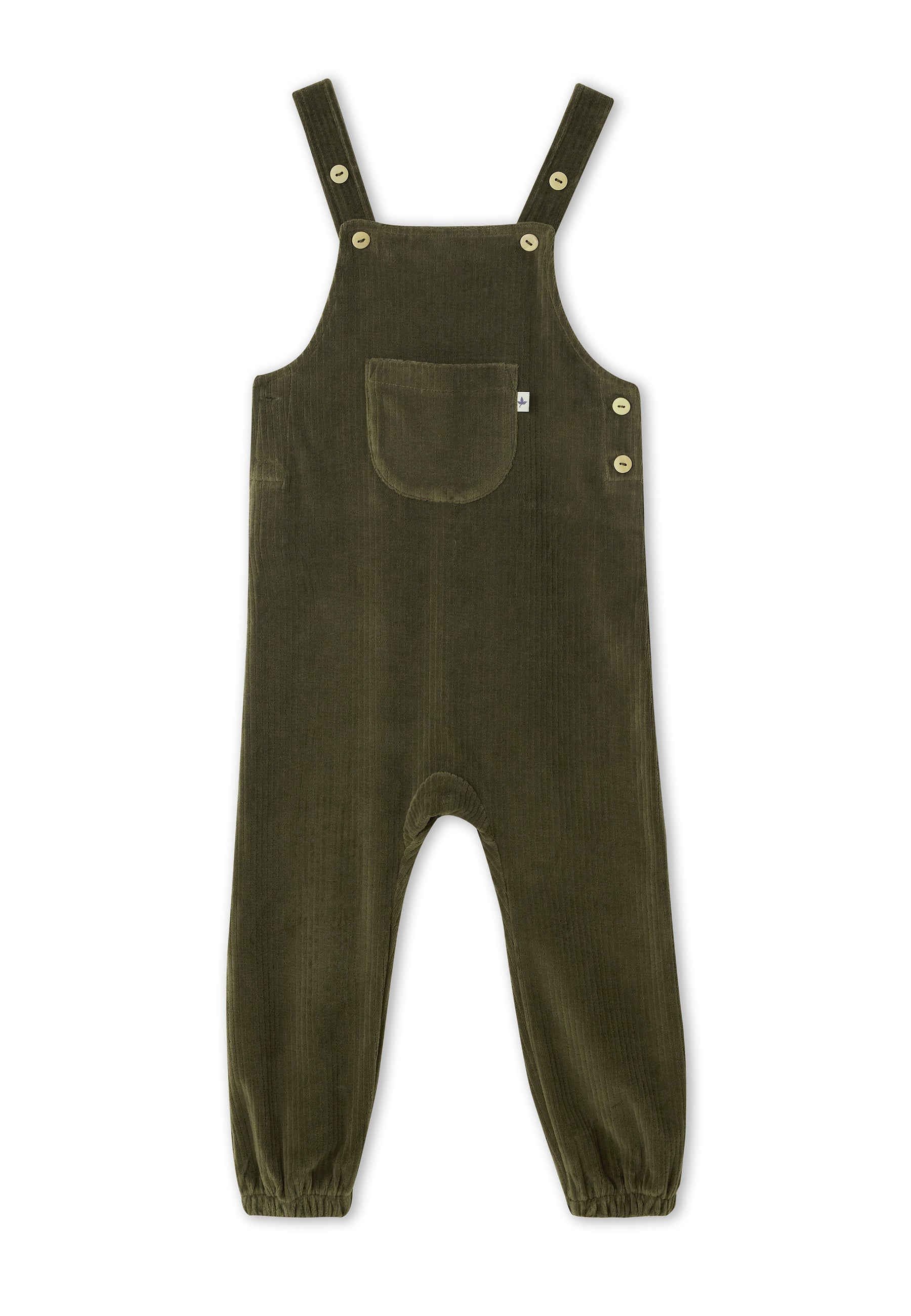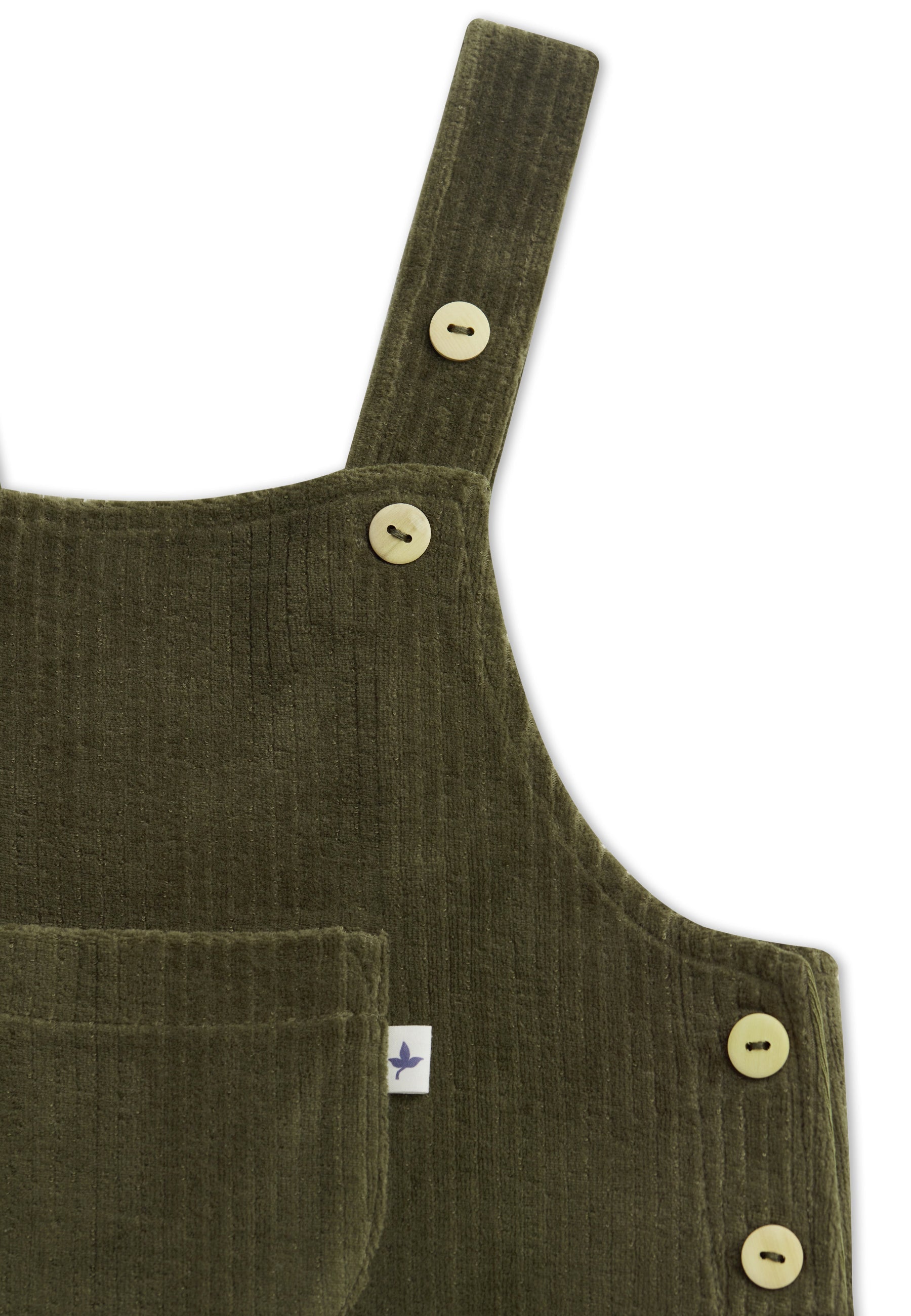 Latzhose aus feinem Cordstoff, 100% Bio-Baumwolle (kbA) kombiniert mit verstellbaren Trägern und seitlichen Holzknöpfen. Kleine Latztasche vorne. Am Beinabschluss ist ein weiches Gummi eingenäht.