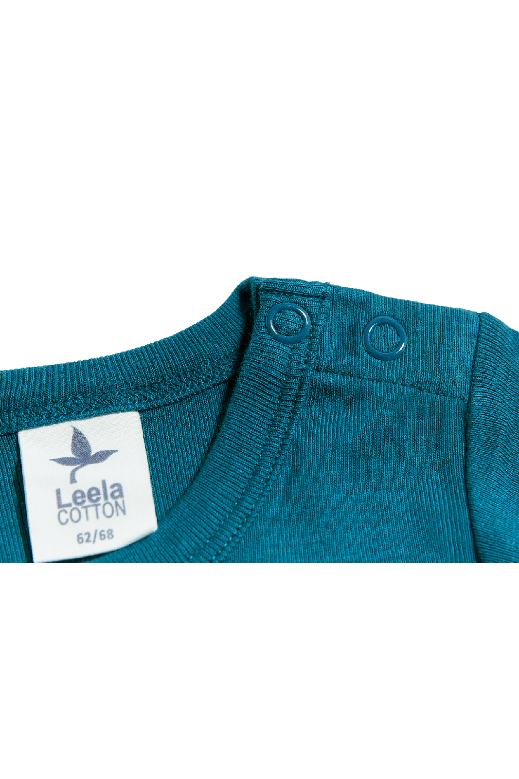 Hochwertiger Rippjersey Langarmbody aus 100% Bio-Baumwolle (kbA) in einem ruhigen Donaublau. Besonders atmungsaktiv und angenehm zu tragen, mit nickelfreien Druckknopf an der Schulter und im Schritt.
