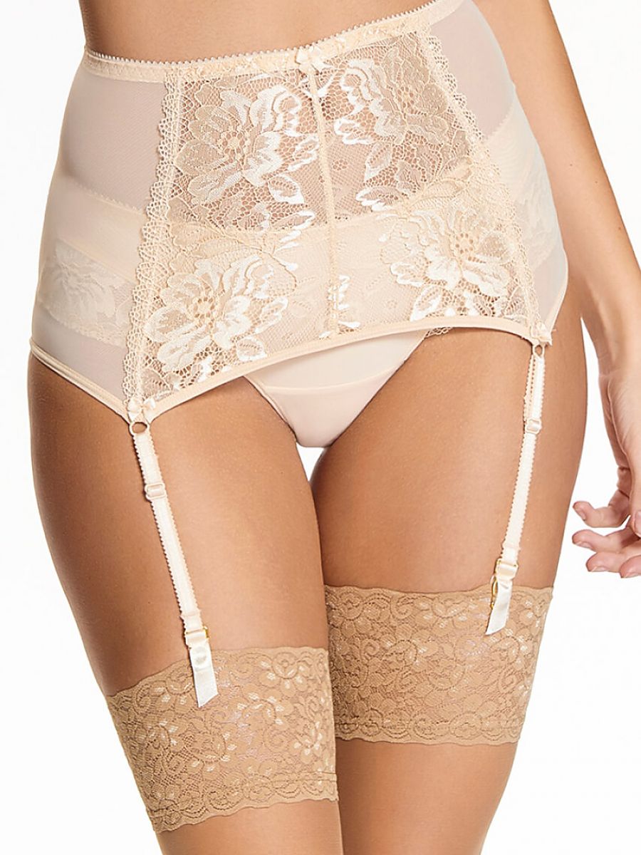 High garter belt in beige, made of soft tulle mesh. Front decorated with elegant, delicate embroidery, smooth back made of tulle mesh, adjustable fastening with hooks.