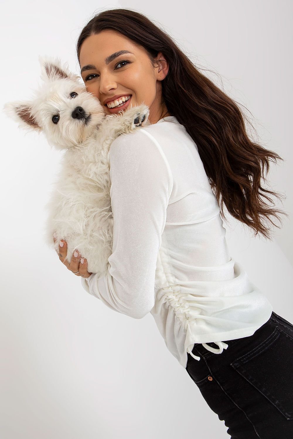Short velour blouse with long sleeves and a round neckline. On the sides there are ties to adjust the length.