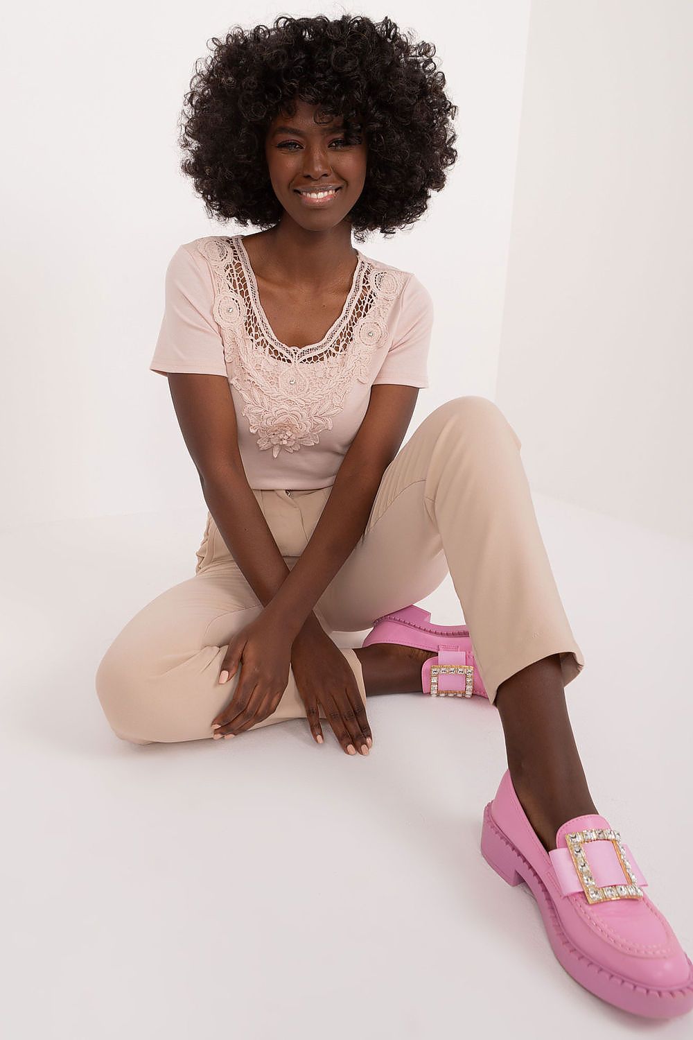 This everyday blouse is a unique combination of casual style with delicate feminine details, a perfect choice for everyday outings. Made of skin-pleasing cotton, it guarantees comfortable wear, perfect for a dynamic lifestyle. The blouse's smooth design makes it suitable for combining with a variety of closet items, allowing you to create diverse looks. The standard length and short sleeve give the blouse versatility, allowing it to be worn in a variety of situations. The round neckline adds lightness and subtlety to the blouse, while remaining comfortable to wear. The lace placed on the front gives the blouse a feminine charm, emphasizing the delicacy of the design. Zircons add sparkle and elegance, creating a unique, subtle accent on the front of the blouse. The predominant material, cotton, makes the blouse comfortable against the skin, making it an excellent choice for active, everyday life. The addition of lace and zirconia add character to the blouse, making it perfect for a variety of situations, from a stroll to shopping to an informal meeting with friends. All in all, this everyday blouse is a combination of comfort, casual casualness and feminine touches that will make you always look stylish and feel comfortable.