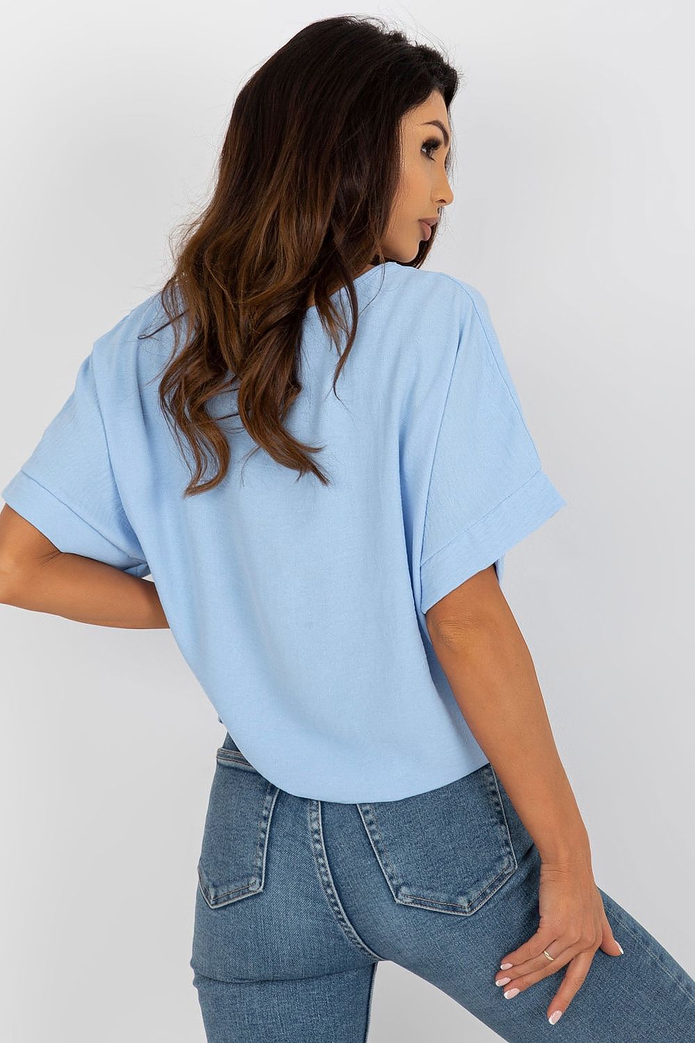 Blouse in a loose fit with short sleeves and a v-neck. Decorative binding at the bottom.