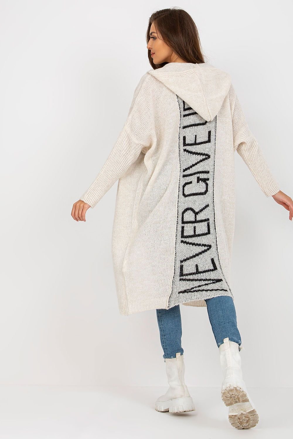 Long cardigan with long sleeves, and a hood, unbuttoned. Decorative contrasting inscription on the back.