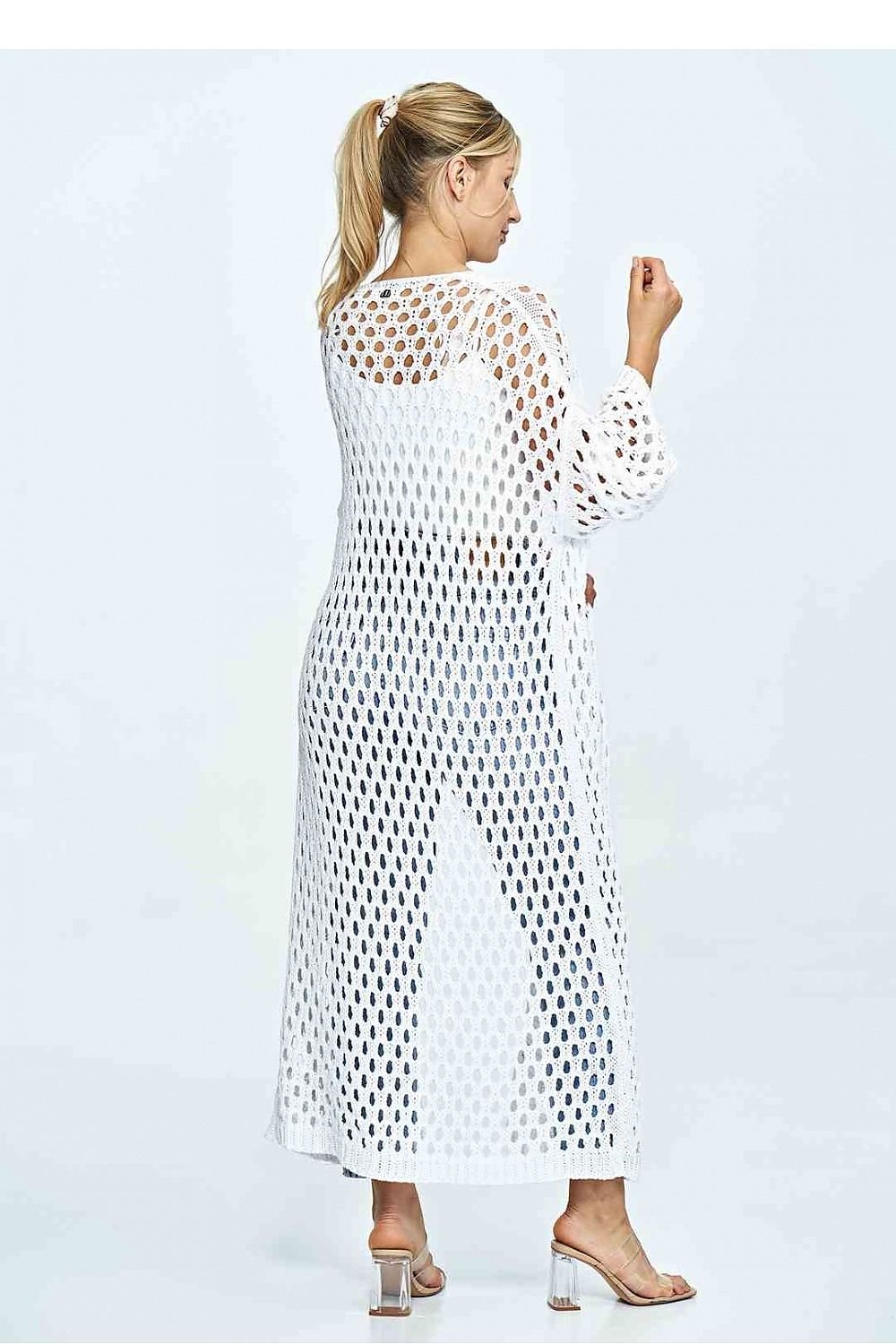 Long openwork cardigan with wide 3/4 sleeves, no fastening and pockets.