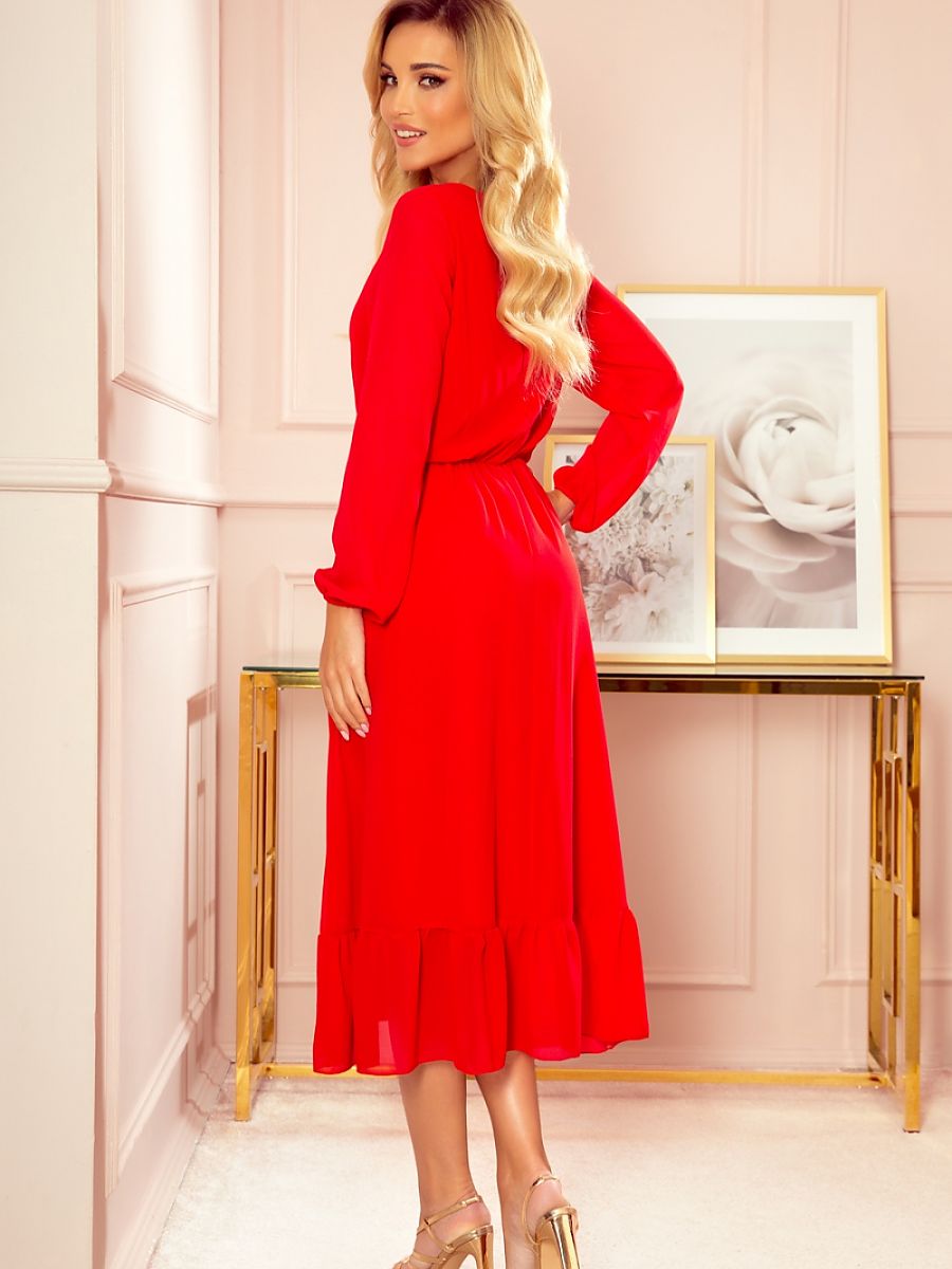 Airy chiffon midi dress with neckline and frills, red color. Polish production. Numoco brand.