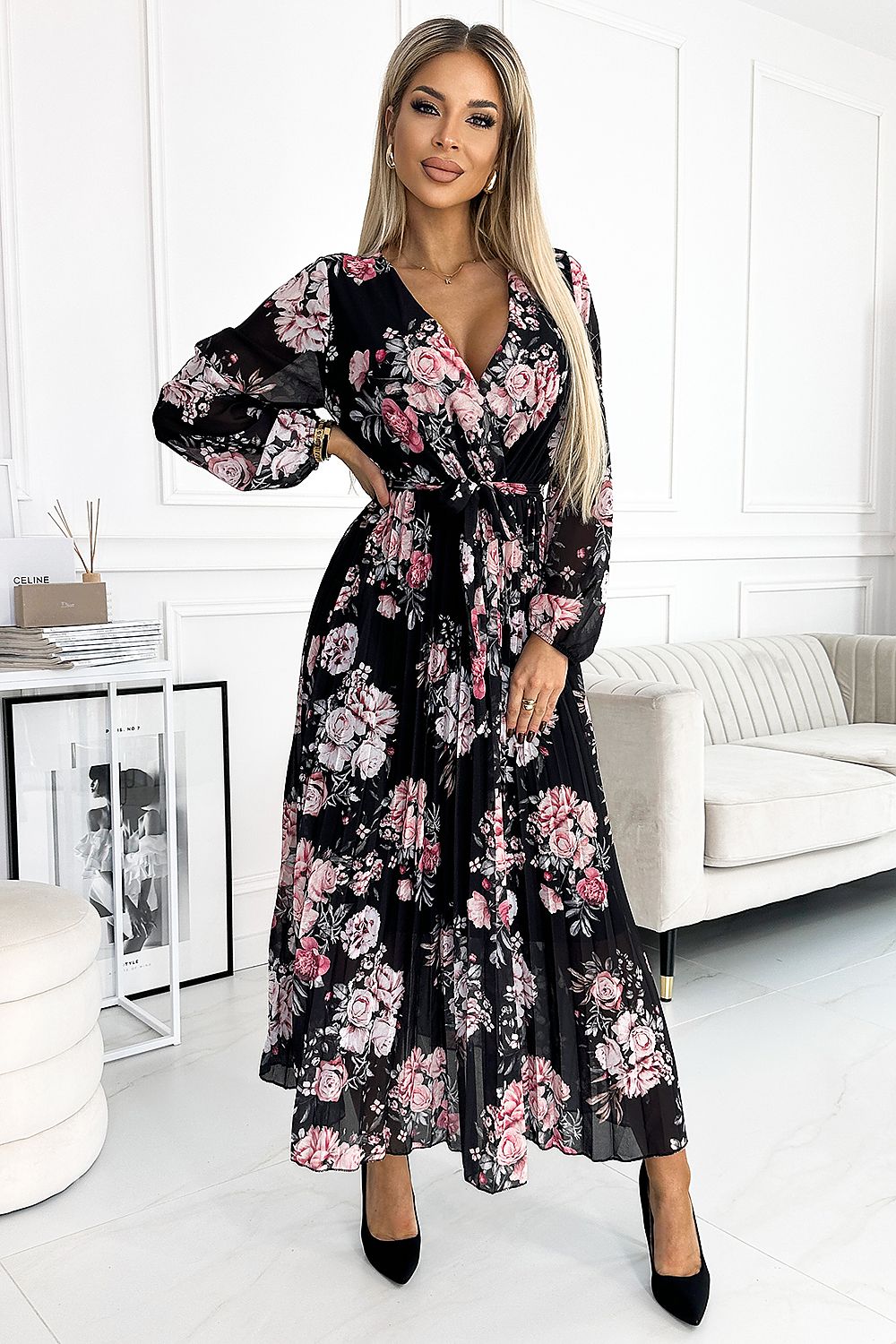 Chiffon long pleated midi dress with neckline, long sleeves and waist tie. Pattern: red and pink roses on a black background. Brand numoco basic. European production.