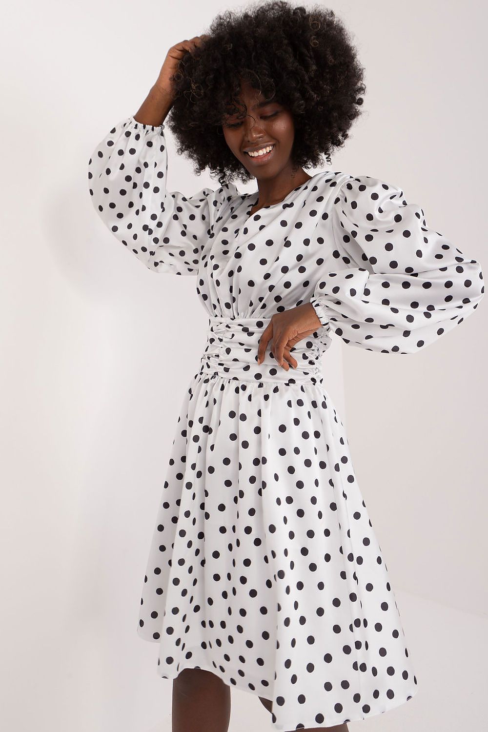 Cocktail dress is the quintessence of elegance and chic, ideal for special occasions. Its flared cut adds lightness, while making the woman wearing it feel extremely feminine. This dress is a perfect choice for parties or formal occasions. The pattern with dominant peas gives the dress a subtle and classic touch. Made of high-quality cotton, the dress delights not only in its appearance, but also in its comfort. The pre-knee length makes it an ideal option for many different occasions. The heart neckline emphasizes the neck and adds elegance to the dress, while the covered zipper closure allows for a precise fit. The puffy long sleeve gives the dress a light and romantic feel, while providing a fashionable accent. The dress is comfortable thanks to the lining, which makes wearing it even more comfortable. Decorative creases on the shoulders and waist add uniqueness to the dress and emphasize the feminine silhouette. This cocktail dress is a combination of elegance, comfort and fashionable finesse, ideal for evening meetings or special occasions.