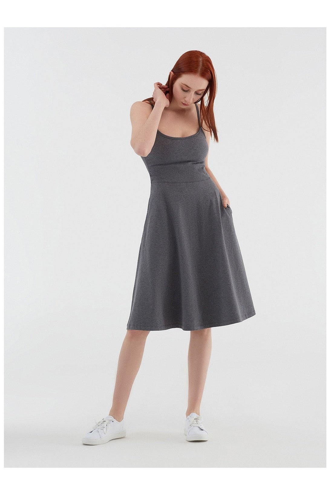 Unifarbenes Kleid in Anthrazit-Melange, aus weichem Baumwolljersey (95% Bio-Baumwolle kbA, 5% Elasthan). Das Kleid ist leger geschnitten, mit schmalen Trägern, die einen aufregenden Rücken zaubern. Außerdem hat das Kleid zwei seitlichen Eingriffstaschen. Der Stoff ist sehr angenehm auf der Haut und verleiht einen ausgezeichneten Tragekomfort.