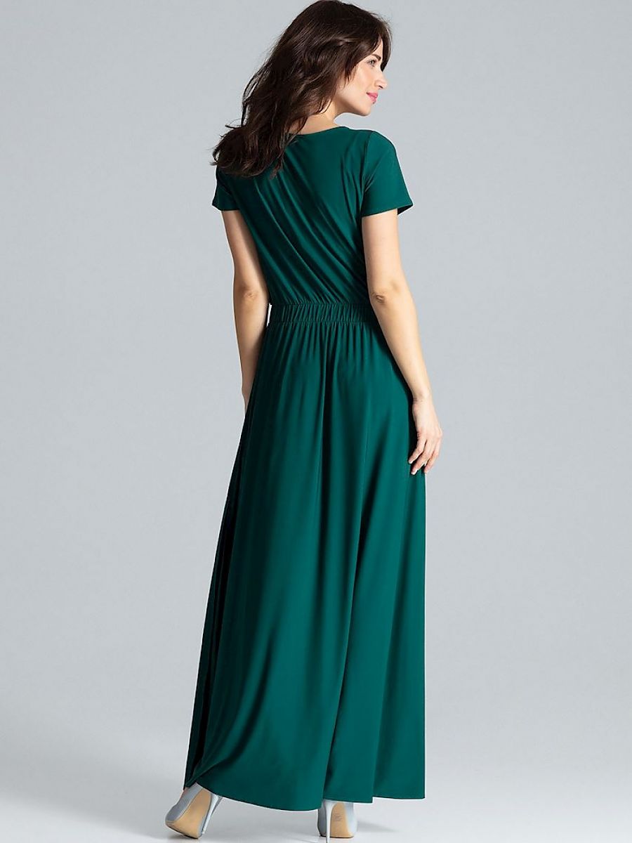 Long dress with short sleeves. Wide elastic waistband with double stitching. Slits in the sides of the skirt. Dress without a fastener, pockets and lining.