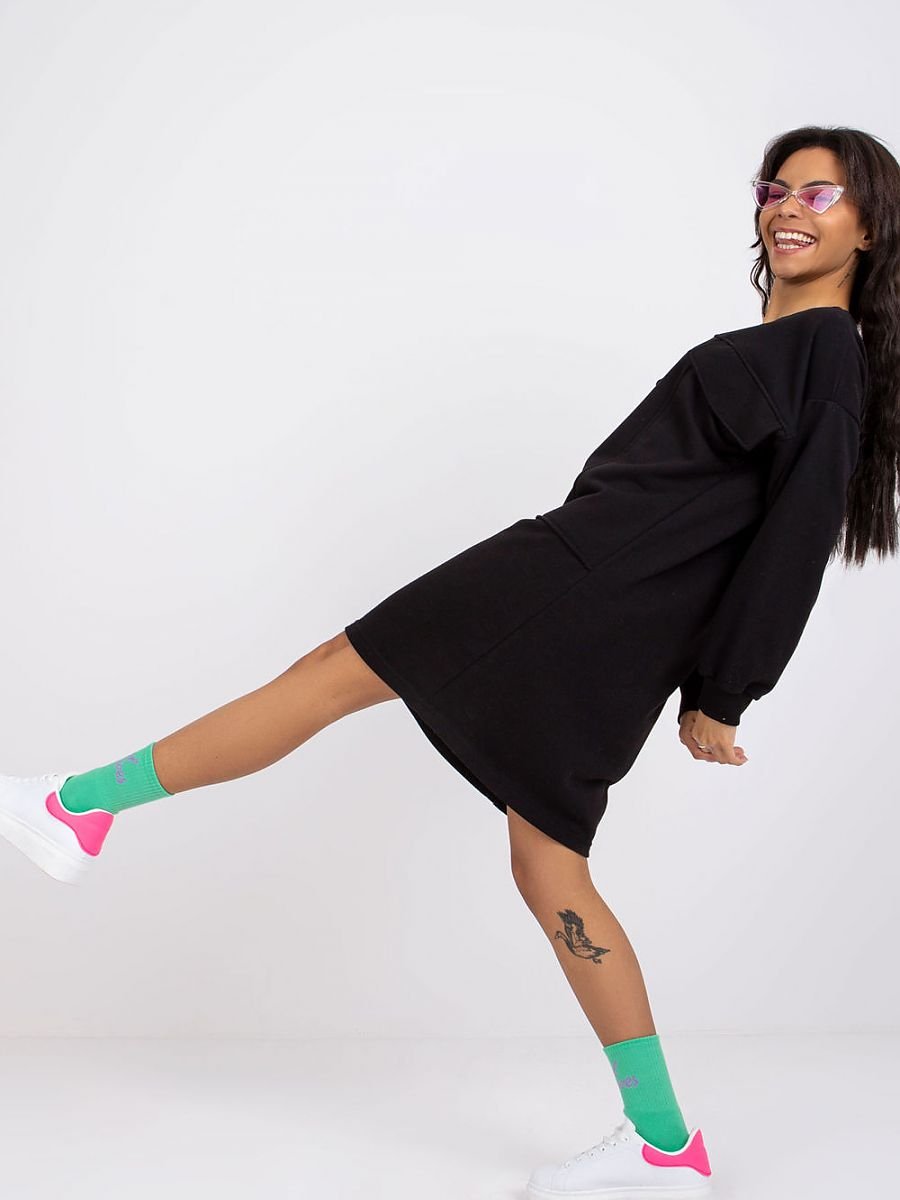 Loose-fitting dress with long sleeves. On the front pockets with patches. Ideal for everyday wear.
