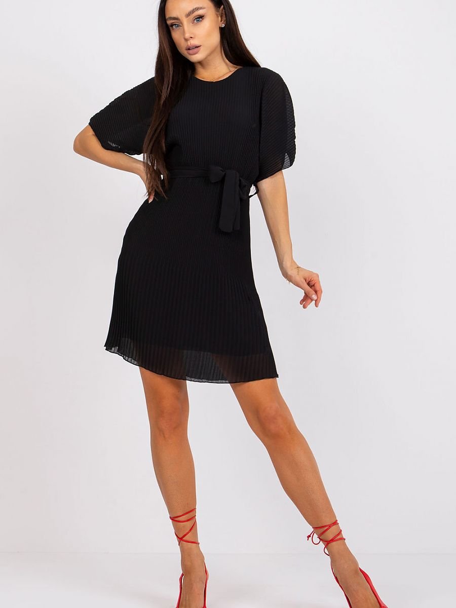 Lined dress with short sleeves. At the waist elastic band and tie belt. Perfect for many occasions.
