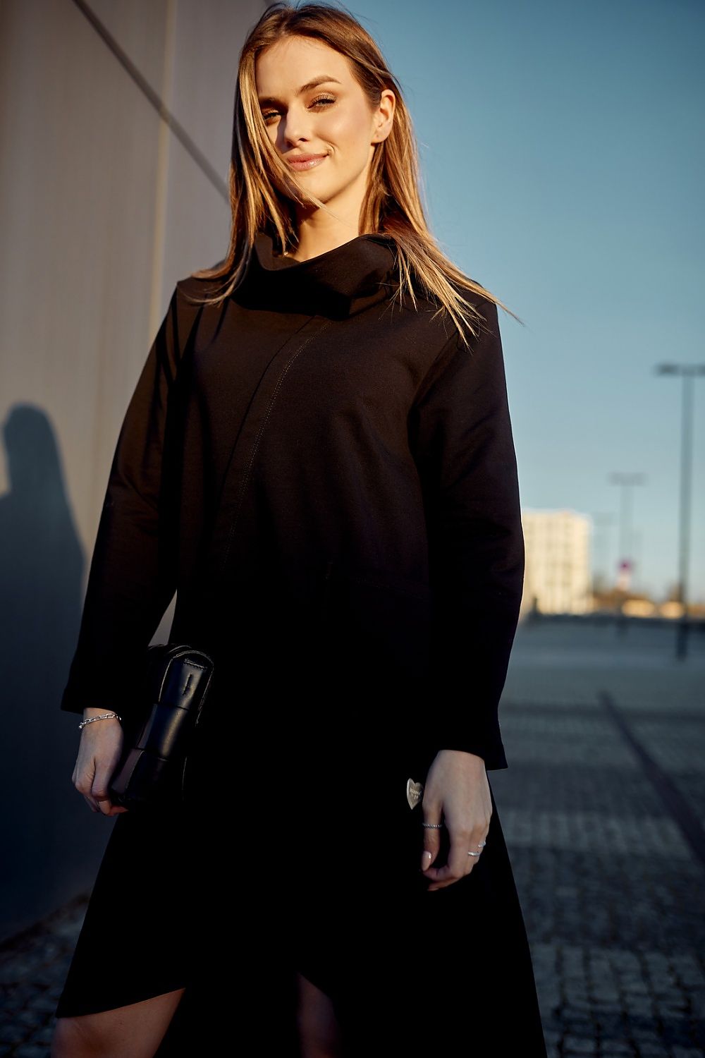 This asymmetrical everyday dress is the perfect choice for lovers of loose cuts and sophisticated casualness. The dress features long sleeves, a wide turtleneck and a large pocket.