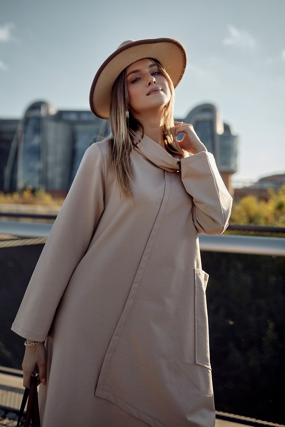 This asymmetrical everyday dress is the perfect choice for lovers of loose cuts and sophisticated casualness. The dress features long sleeves, a wide turtleneck and a large pocket.