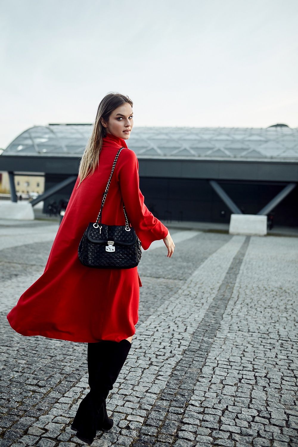 This asymmetrical everyday dress is the perfect choice for lovers of loose cuts and sophisticated casualness. The dress features long sleeves, a wide turtleneck and a large pocket.