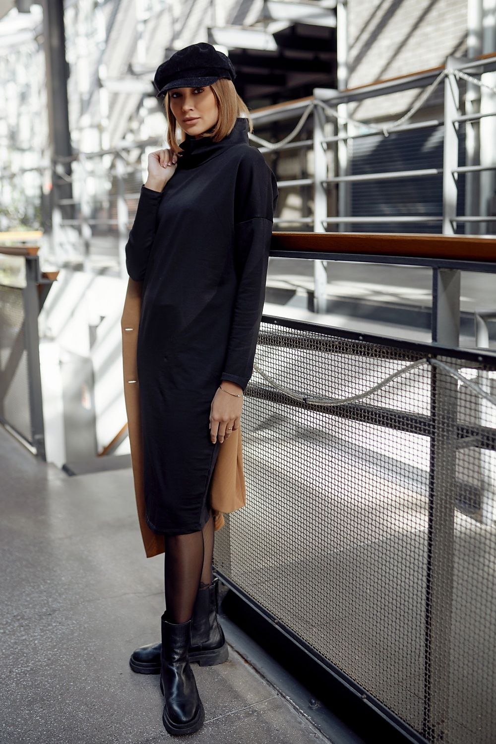 A navy blue, loose-fitting sports dress with long sleeves and a voluminous turtleneck is perfect for everyday styling. The dress has slip pockets. The cut perfectly conceals all imperfections of the figure.