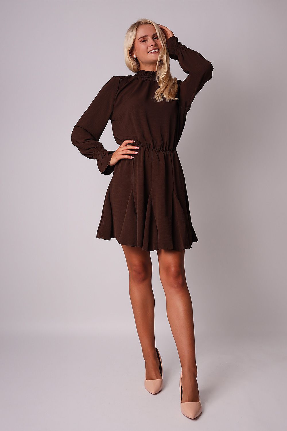 This chocolate skater dress with crinkle detailing is a closet essential. It has a ruffled collar, long sleeves with ruffled cuffs, an elastic waist and a flared hem. Wear it with strappy stilettos for an evening look, and boots for daytime.