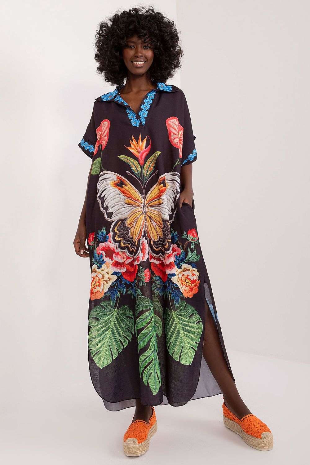 This summer dress is a combination of casual and functional, perfect for any occasion from casual walks to the beach to relaxed gatherings with friends. Its oversize cut provides a loose, comfortable look that is both fashionable and practical. Made of lightweight linen with added polyester, this dress is not only comfortable against the skin, but also breathable, perfect for warm days. An added bonus is the slip pockets on the sides, which add functionality and casual charm. The dress has short sleeves and a collar and v-neck, giving it a subtle, girly look. The colorful print adds energy and fun to it, making every day even more colorful and charming. With its versatile design and lightweight, tactile fabric, this dress will be a great choice for summer days, whatever the occasion.