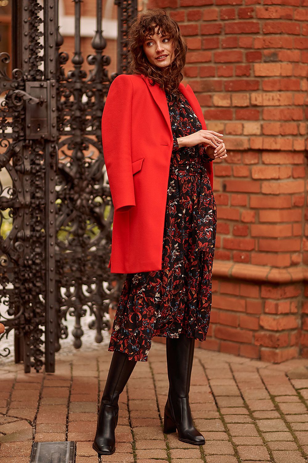 Captivating with its relaxed and casual style, this long and flared dress features long buffeted sleeves ending in a cuff with a button closure. It has an eye-catching collar on a delicate stand-up collar with a button closure at the back and a practical belt to tie it at the waist made of the same material. It has been enriched with a beautiful floral print all over and magnificent ruffles at its bottom, being a must-have for both party and festive styling.