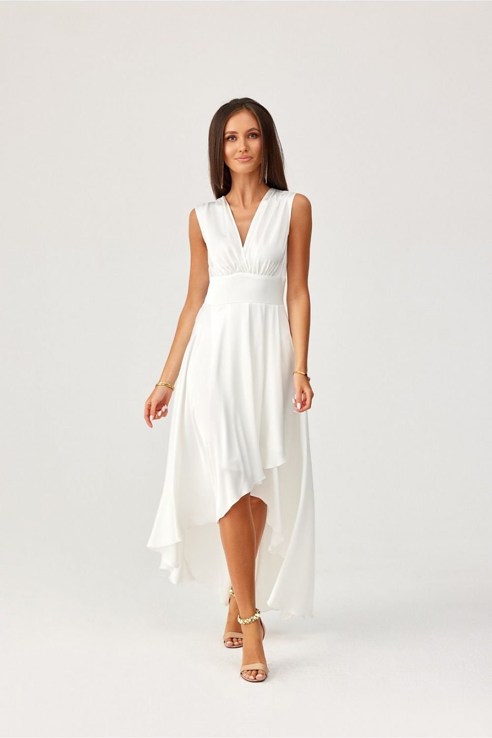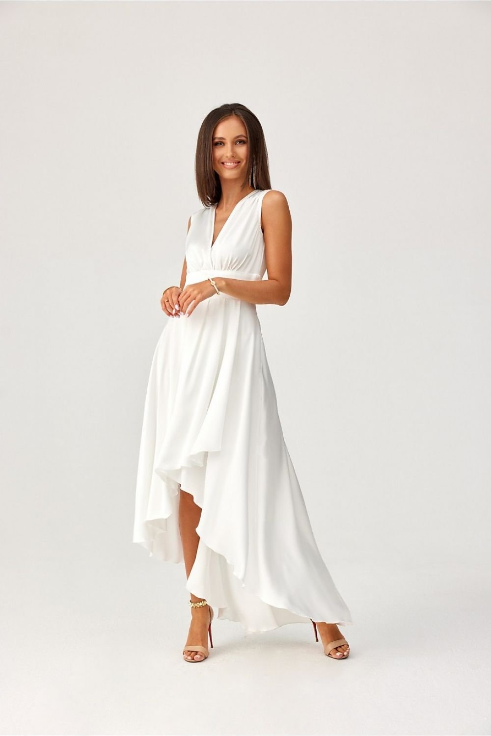 The maxi dress is made of shimmering satin fabric. Its asymmetrical hem and deep neckline add subtle femininity, while its flared cut ensures freedom of movement. The evening dress has a beautiful envelope neckline, which optically lengthens our figure and beautifully emphasizes the bust. Wide tapering at the waist, which will beautifully emphasize the feminine assets. The maxi dress is also characterized by an asymmetrical cut, which allows you to show your legs. The dress is fastened with a covered zipper at the back of the model. The product is manufactured and sewn in Poland.