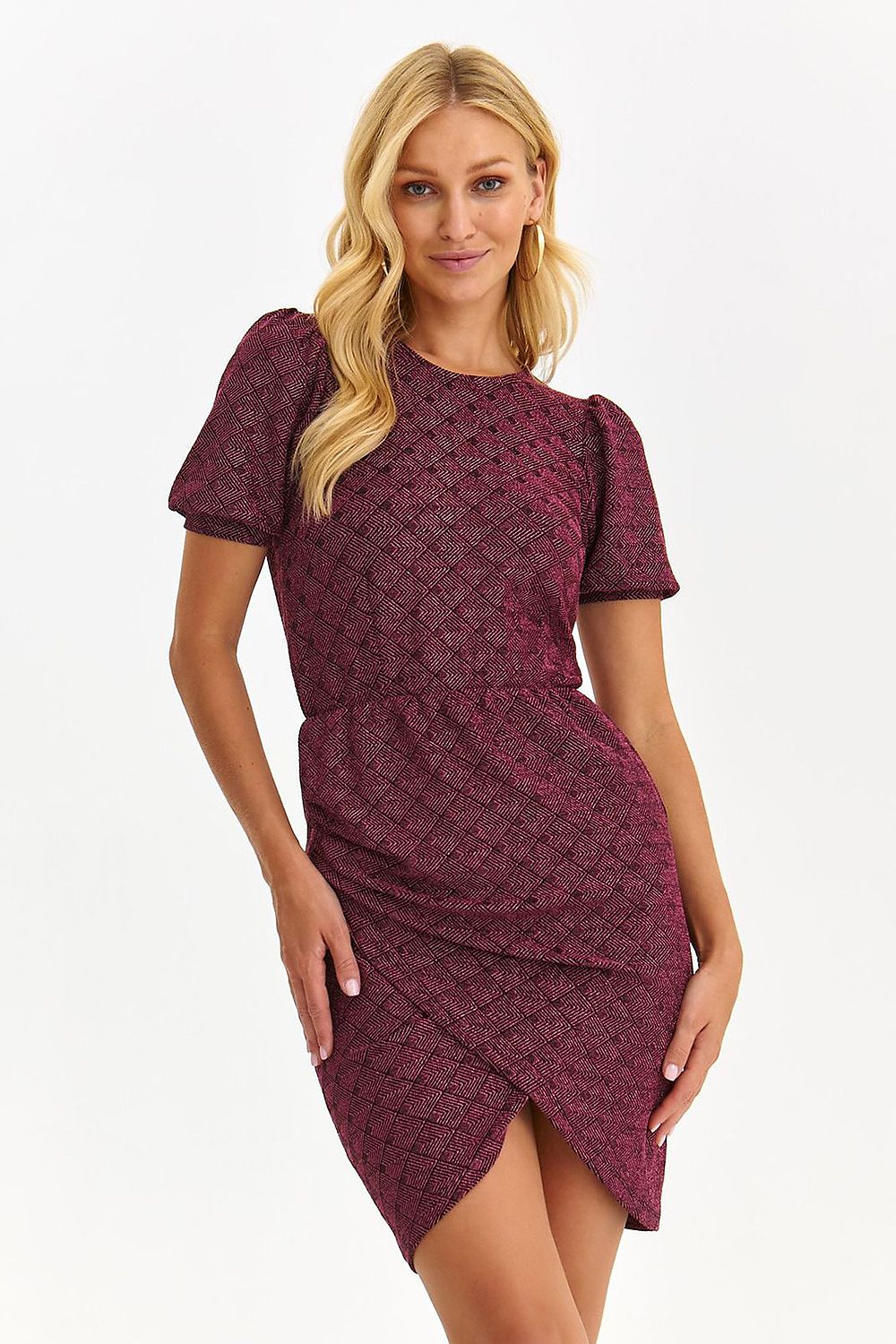 An incredibly glamorous and graceful women's mid-thigh length dress with a ruffled envelope front bottom. It has short buffet sleeves finished with a ribbed hem and a round neckline at the front. It is made of a very nice-to-touch knitwear with addition of metallic yarn. Great for a variety of outfit and party styling. The dress is available in pink.