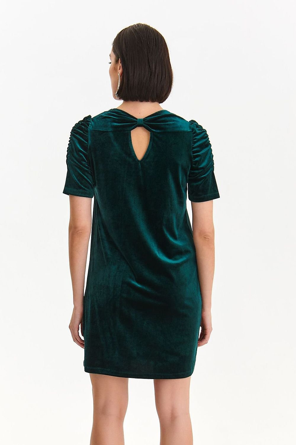 Women's dress with a straight cut and mid-thigh length. It has short buffet sleeves crinkled all over and a magnificent heart-shaped neckline. A delicate knotting on the back along with a striking teardrop slit adds to its charm. It is made of pleasant to the touch and good quality velvet knit, captivating with its softness and delicate sheen. It will perfectly suit as an element of a woman's outfit and party styling, being appreciated for its elegance and impeccable style. The dress is available in dark green.