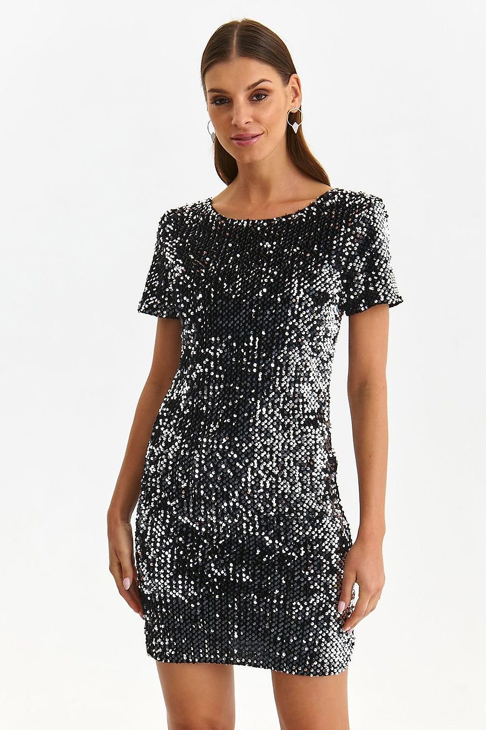 Full of unusual elegance, this women's dress has a simple cut, which clings to a woman's figure and exposes her assets. It has straight short sleeves and a striking round neckline, as well as an exposed upper part of the back. It is made of delicate and pleasant to the touch knitwear, enriched with shiny sequins throughout, being a great idea for an unconventional party outfit. It is especially recommended for women who appreciate extravagance. The dress is available in silver color.