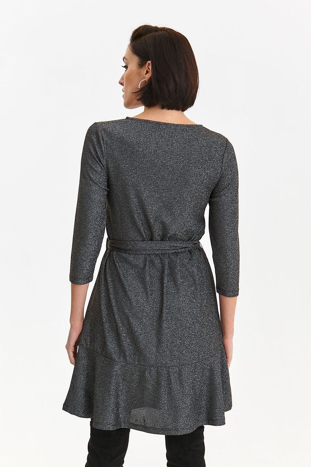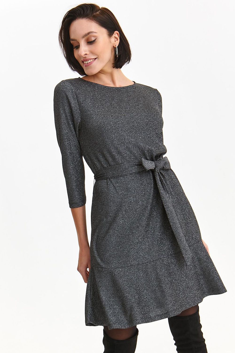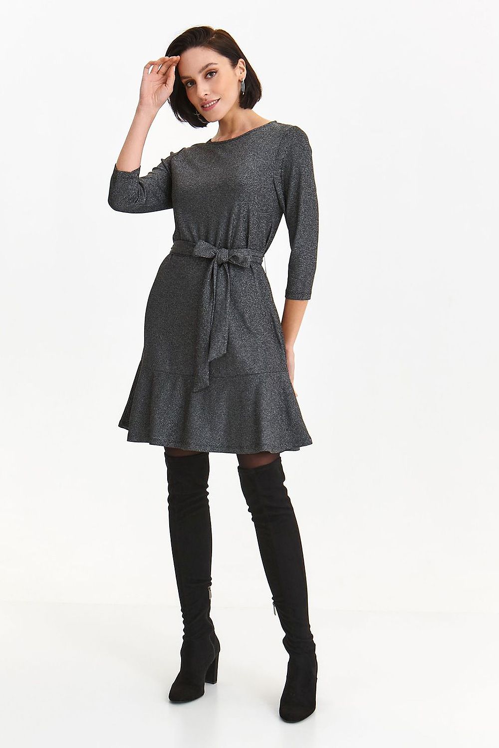 Captivating in its comfort during use, the A-line, knee-length women's dress has straight 3/4-length sleeves. It features a round neckline with delicate piping around it, while a magnificent ruffle at the bottom adds to its charm. It is made of pleasant to the touch and delicate knitwear with an addition of metallic thread, enriched with a waist tie using a wider belt of the same material, emphasizing the slimness of a woman's figure. It is the perfect complement to virtually any woman's casual styling. The dress is available in gray.