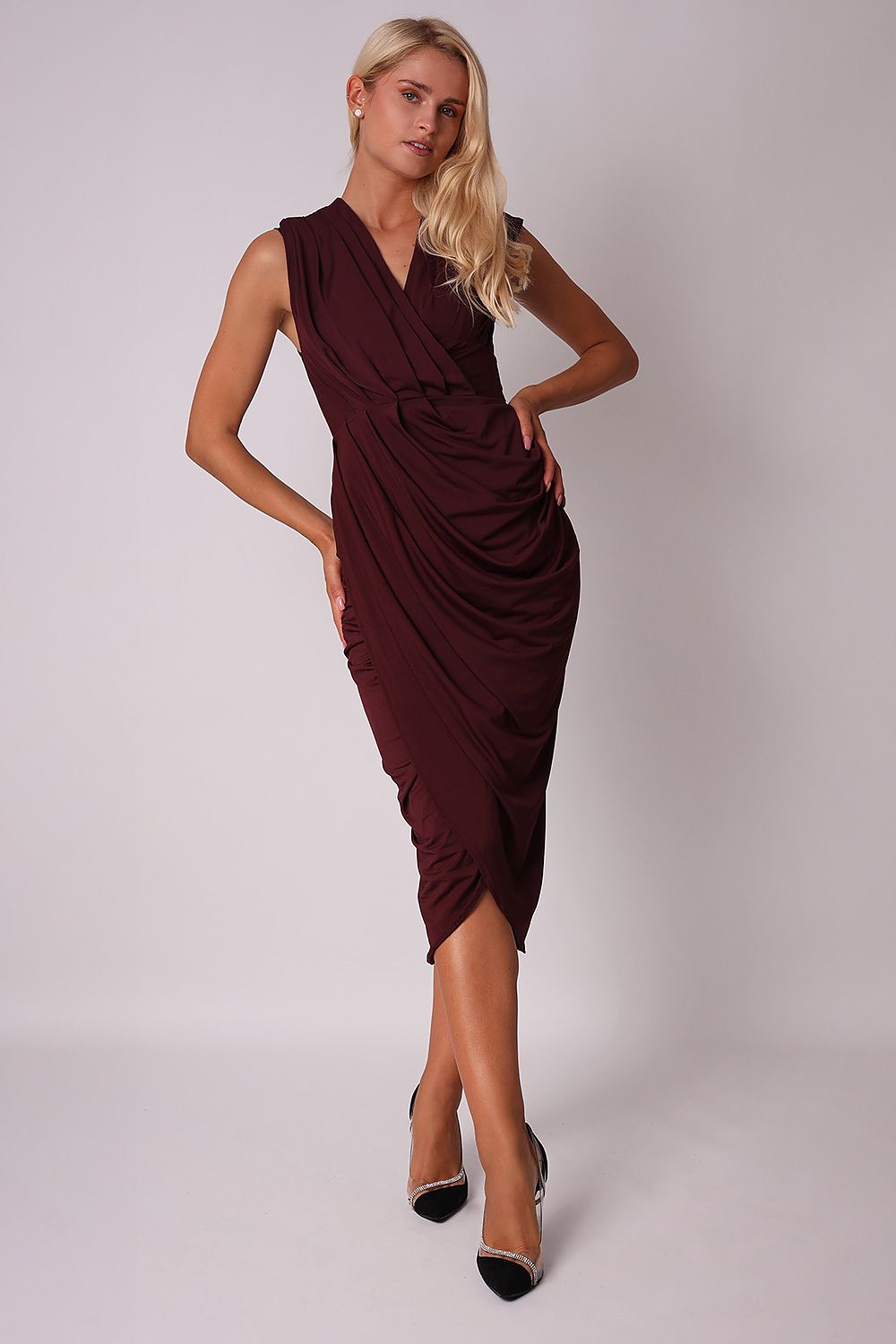Contour your curves in our draped midi dress in plum color, made from our premium stretch fabric. The dress features a ruffled, envelope top with a V-neckline and a draped envelope bottom. The dress fastens with a covered zipper. Pair with heeled shoes and a clutch bag for the perfect look for a variety of occasions.