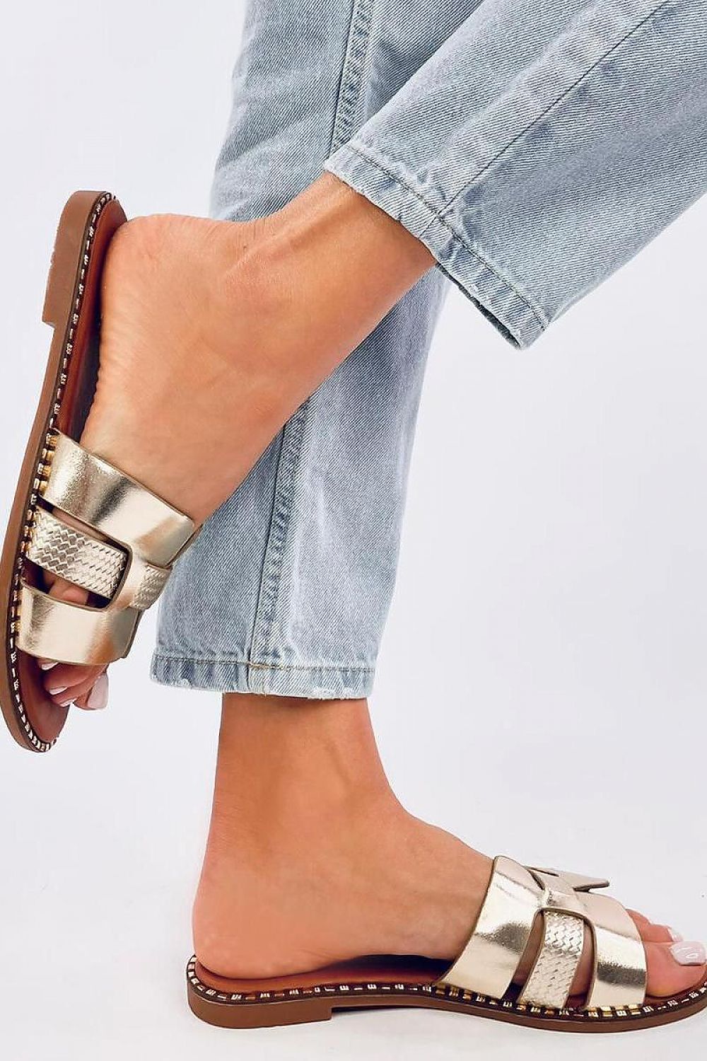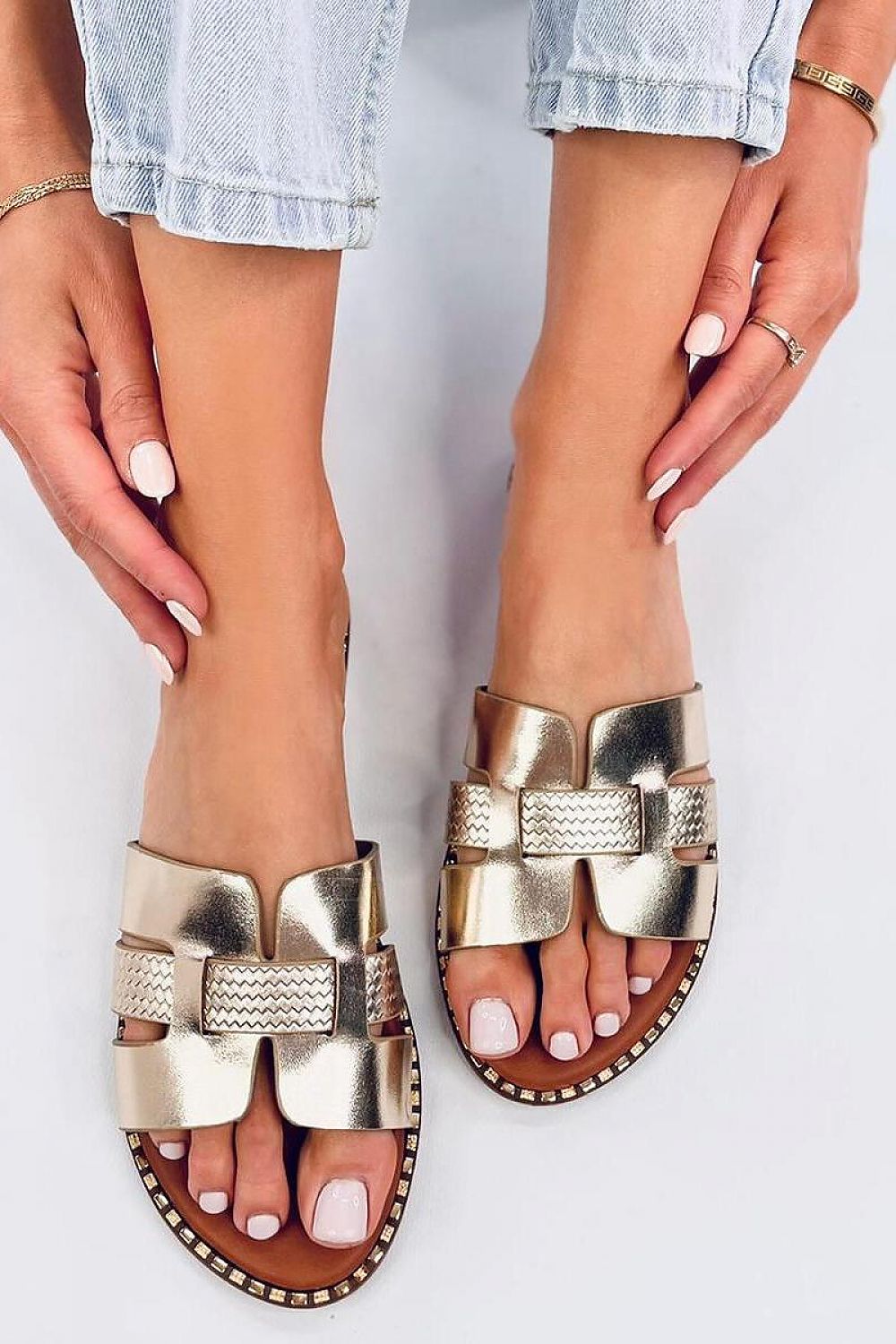 Elegant women's flip-flops on a flat sole. The model is distinguished by a stylish design with decorative trim in gold finish.... In these shoes you will certainly feel fashionable, feminine and extremely comfortable.... They will certainly meet your expectations : ) Outer material ? ecological leather.