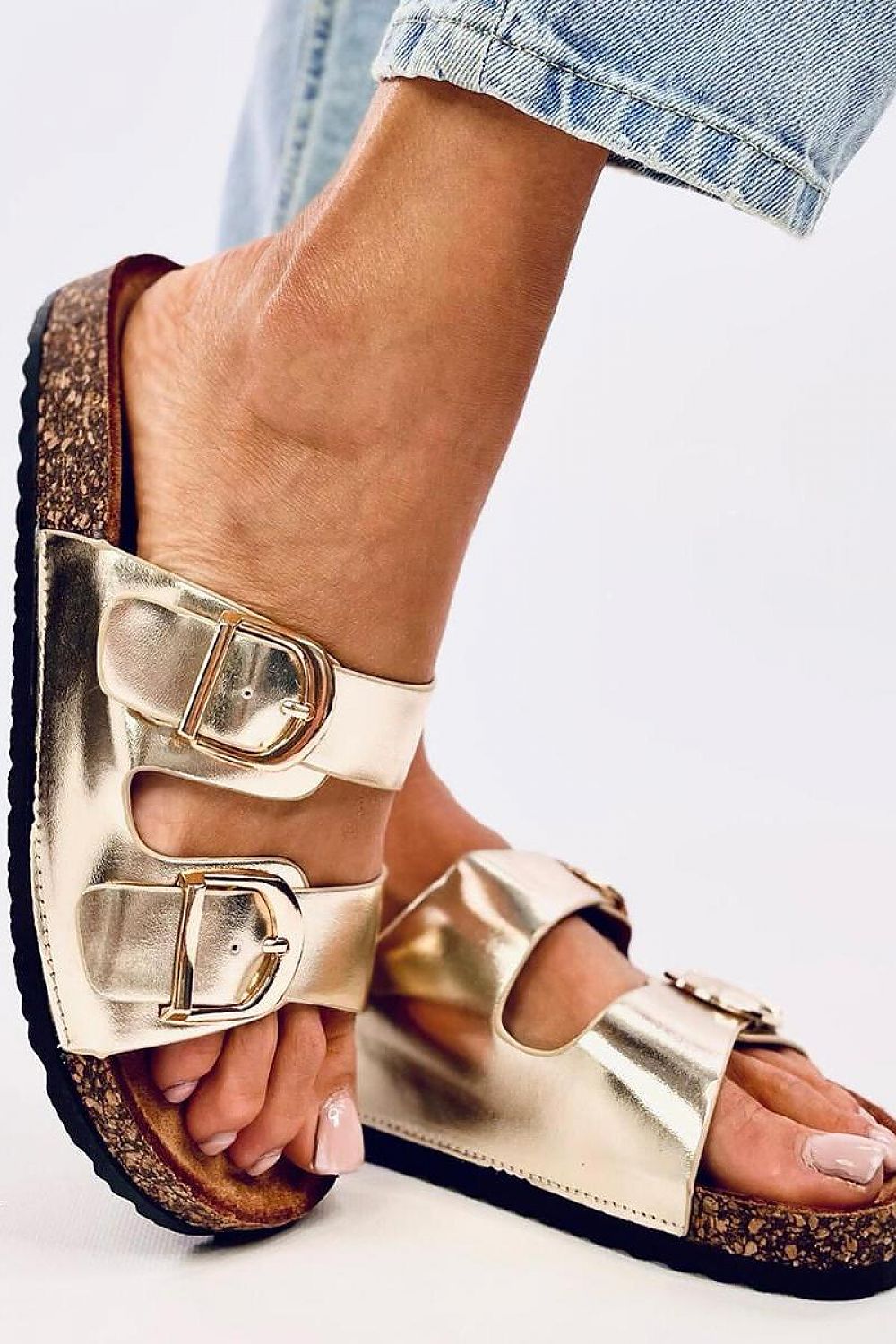 Women's sandals with a cork sole. Adjustable buckles ensure a perfect fit to the foot, and the contoured insole guarantees comfort with every step - see for yourself! These are perfect shoes for the summer :) Outer material - eco-suede/eco-leather (gold color)