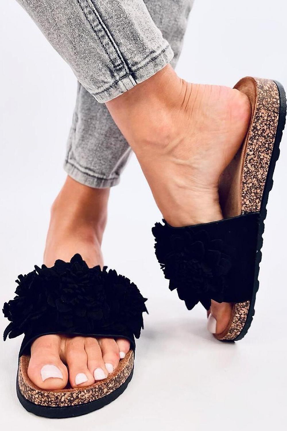 Women's suede mules on cork. The floral appliqué wonderfully enhances this timeless model... The contoured insole guarantees comfort with every step. These are the perfect shoes for summer! Outer material - eco-friendly suede.
