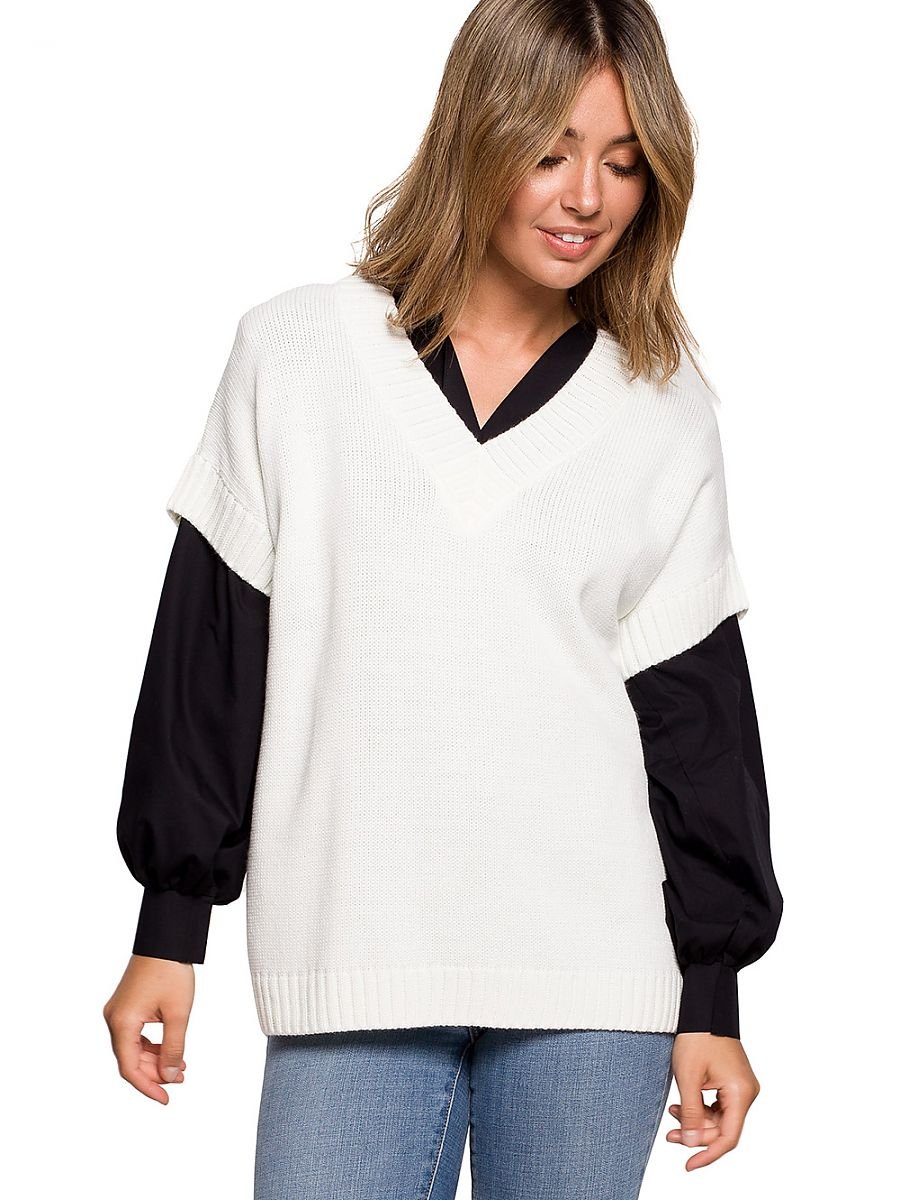 A sleeveless knitwear with a loose cut will complete your business look. With an elegant shirt and classic jeans it will create an interesting outfit for work and beyond. Try combining it with other elements of your wardrobe.