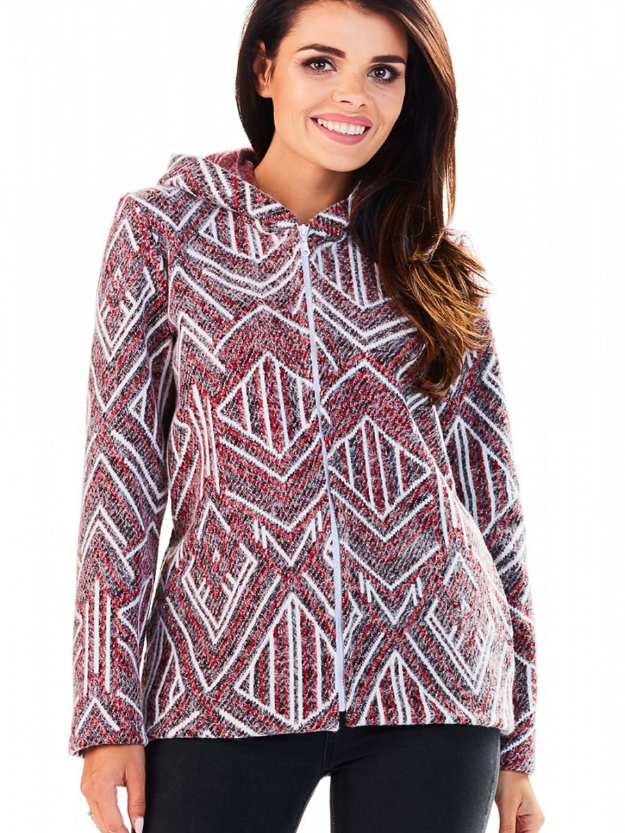 A simple jacket in an interesting pattern in a maroon shade. The jacket has a zip fastening. Slide pockets on the sides. The jacket has a hood.