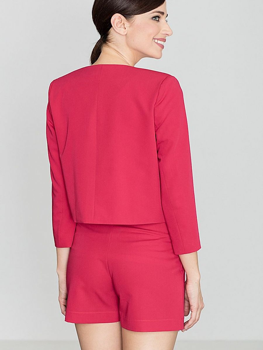A 3/4 length sleeved jacket with a lining for better comfort. A jacket of a modern and stylistically restrained form, boxy shape, a small round neckline, without a fastener. Will add glamour to any styling. Looks good with dresses and trousers.