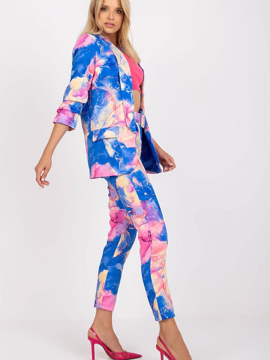 Straight cut jacket made of colorful fabric on a lining. Cushions and creases sewn on the shoulders. Jacket with 3/4 sleeves, without a button. Matches pants in the same color.