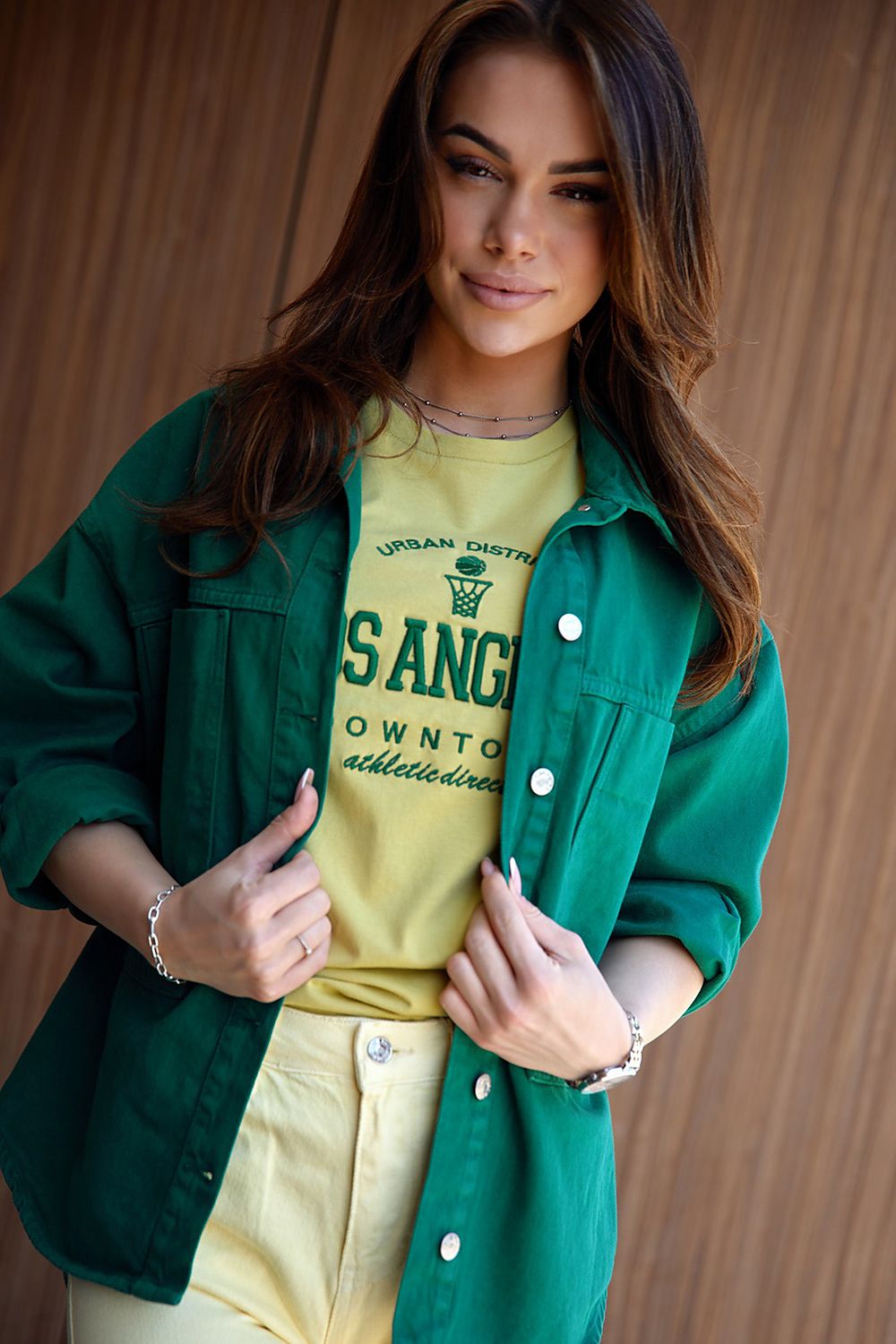 A light beige denim katana is a classic that can't be missing from your outfits this season. The jacket is buttoned, with a lowered shoulder line and long wide sleeves. Large pockets on the front.