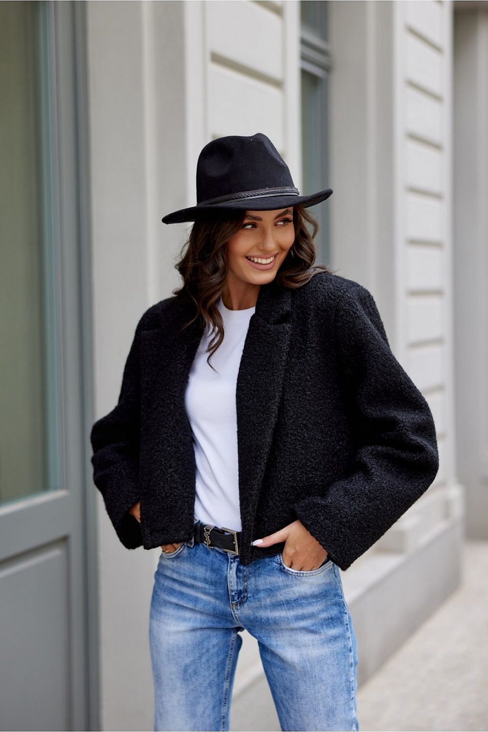 Short jacket of jacket cut with long sleeves, lined collar, fastened with two buttons. The jacket is fully lined. The jacket will be suitable for autumn cold weather. The product is made and sewn in Poland.