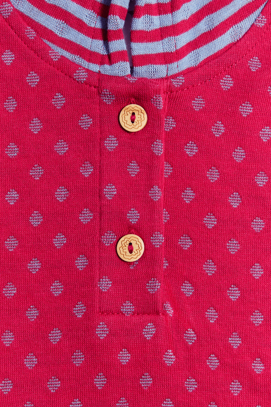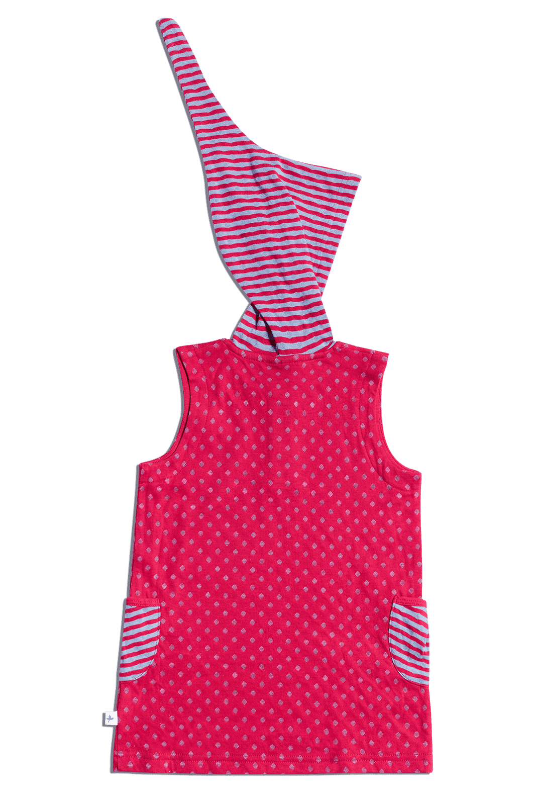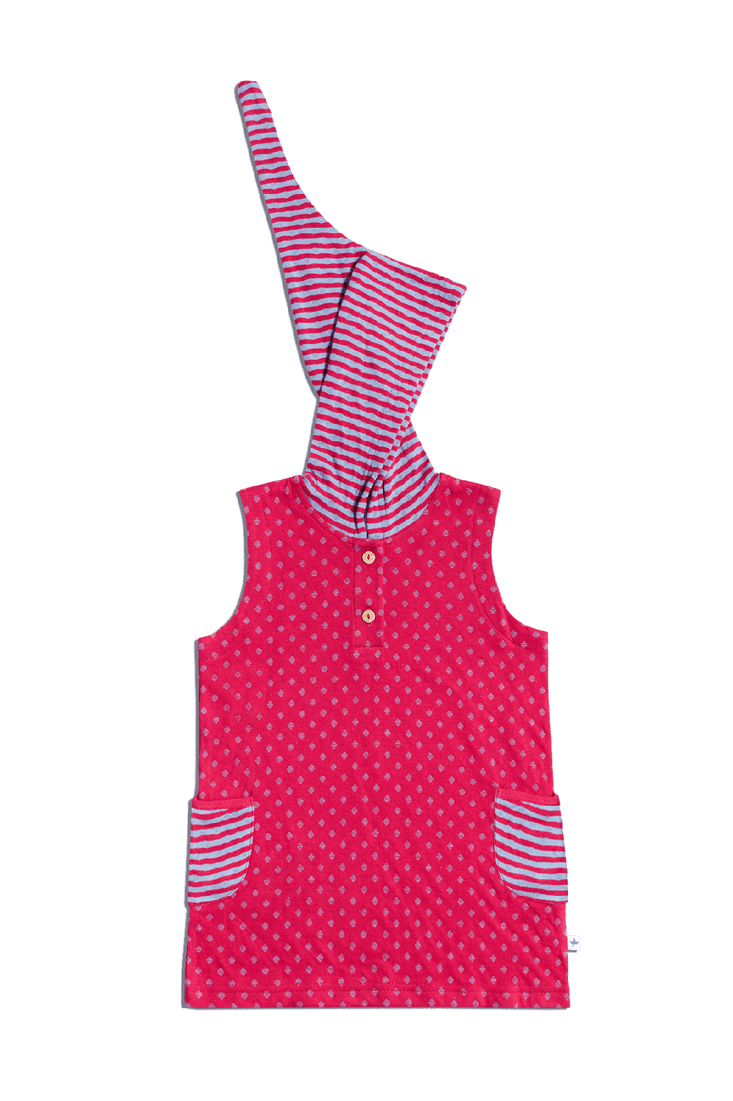 Kurzärmeliges Tunikakleid aus doppelseitigem Interlookstoff 100% Bio-Baumwolle (kbA), in einem orientalischen Persichrot mit taubenblauen Details, lässt uns an die Stadt "Isfahan" denken. Die geringelte Zipfelkapuze und die zwei aufgesetzte Taschen runden den Look ab. Besonders atmungsaktiv und angenehm zu tragen mit vorderen Holzknöpfen, die das Ankleiden erleichtern.