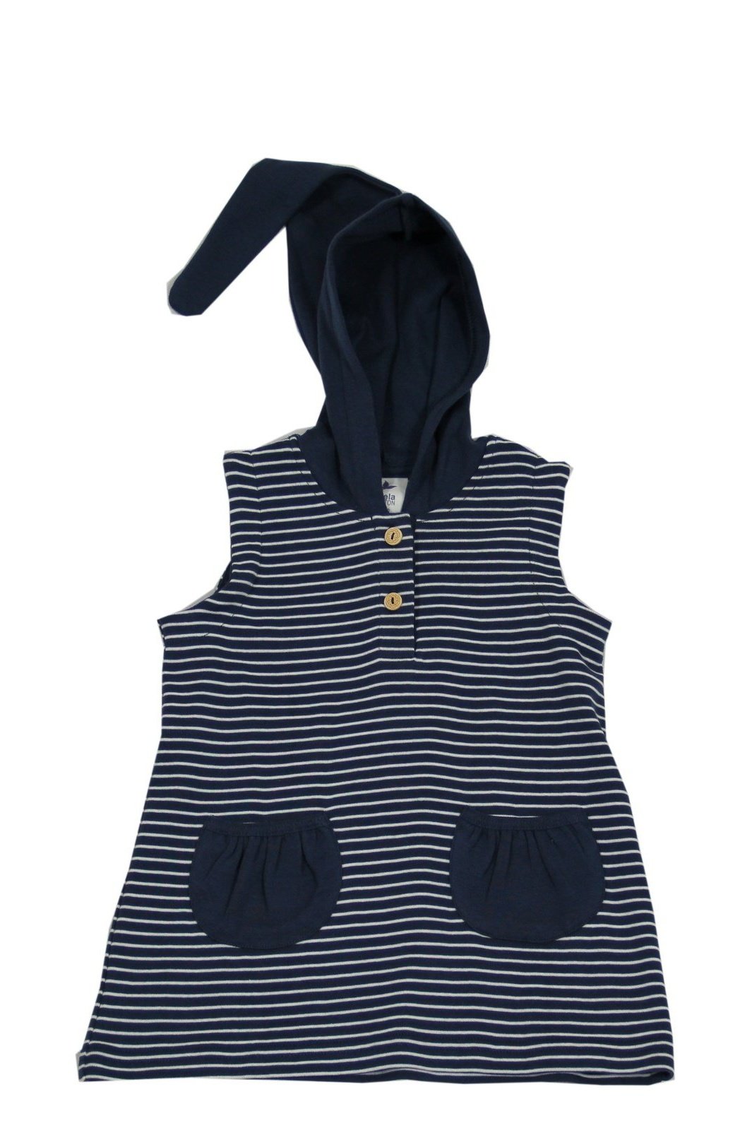 Kurzärmeliges Tunikakleid aus 100% Bio-Baumwolle (kbA) Rippjersey, in einem mitternachts Indigo mit weißen Nadelstreifen. Die einfarbige Zipfelkapuze und zwei aufgesetzte Taschen in indigo, sind die Details der Tunika. Besonders atmungsaktiv und angenehm zu tragen mit vorderen Holzknöpfen, die das Ankleiden erleichtern.