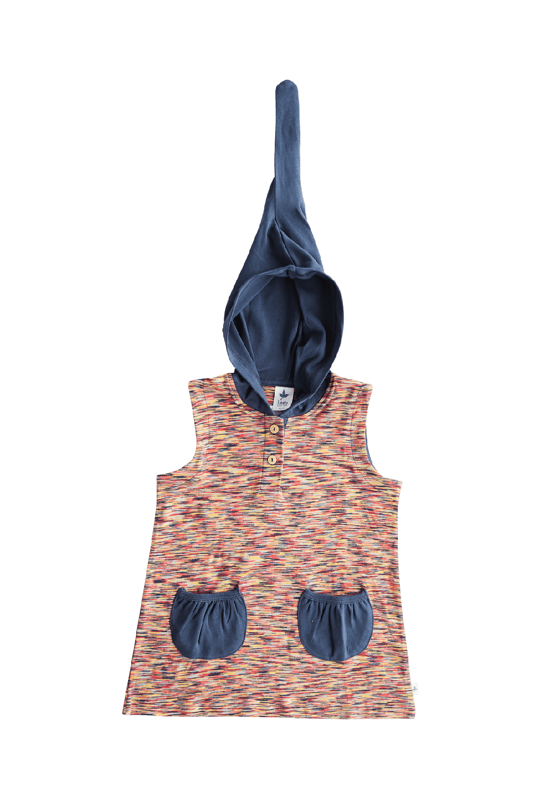 Kurzärmeliges Tunikakleid aus 100% Bio-Baumwolle (kbA) Rippjersey, bunt meliert da fliegen die Gedanken richtung Urlaub und man denkt ans "MEER". Die einfarbige Zipfelkapuze und zwei aufgesetzte Taschen sind die Details der Tunika. Besonders atmungsaktiv und angenehm zu tragen, mit vorderen Holzknöpfen, die das Ankleiden erleichtern.