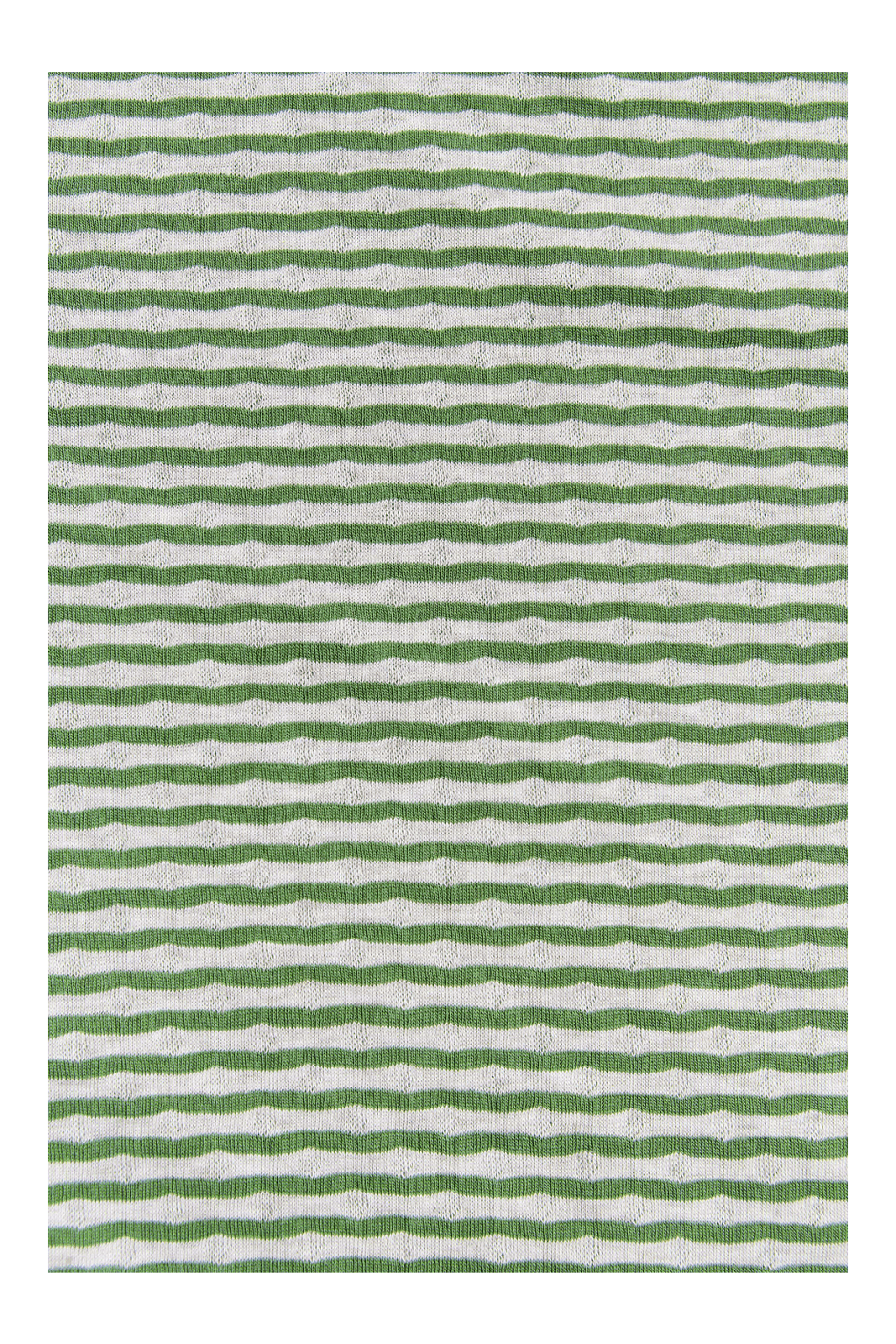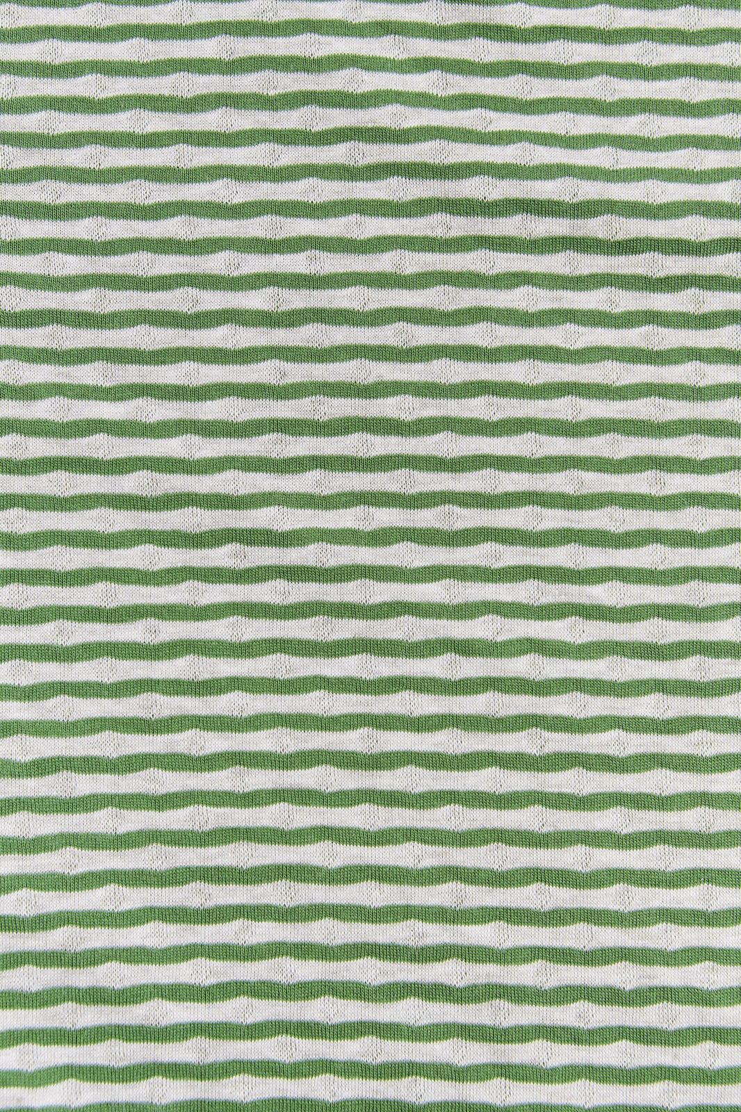 Ein Shirt - zwei Looks. Doppelseitiger Interlookstoff aus 100 % Bio-Baumwolle (kbA) in einem vitalen Waldgrün und Beige-Melange. Eine Seite gestreift und die andere Seite gepunktet. Besonders atmungsaktiv und angenehm zu tragen, mit einem nickelfreiem Druckknopfverschluss an der Schulter, bei der Größe 98/104.