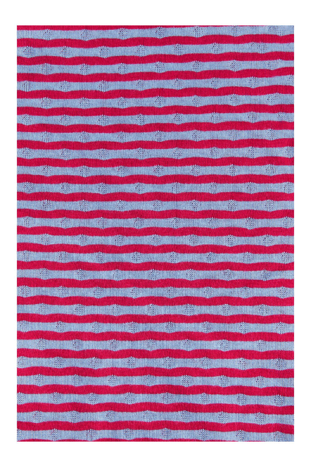 Ein Shirt - zwei Looks. Doppelseitiger Interlookstoff aus 100 % Bio-Baumwolle (kbA) in einem kräftigen Persichrot und Taubenblau. Eine Seite gestreift und die andere Seite gepunktet. Besonders atmungsaktiv und angenehm zu tragen, mit einem nickelfreiem Druckknopfverschluss an der Schulter, der Größe 98/104.
