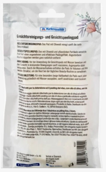 Facial cleansing pad: The pad with olive oil gently cleanses the delicate facial skin. Facial peeling pad: The pad mixed with olive oil and vegetable particles has a pleasant and effective peeling effect. Dead skin cells are removed naturally. Before use, moisten the face pads with water and gently massage the face in circular movements, avoiding the eye area. By absorbing water, the pads unfold their volume and soft structure to pamper the skin during your daily beauty routine. For a particularly long shelf life, rinse the pads thoroughly with water after each use, squeeze them out gently and let them dry.