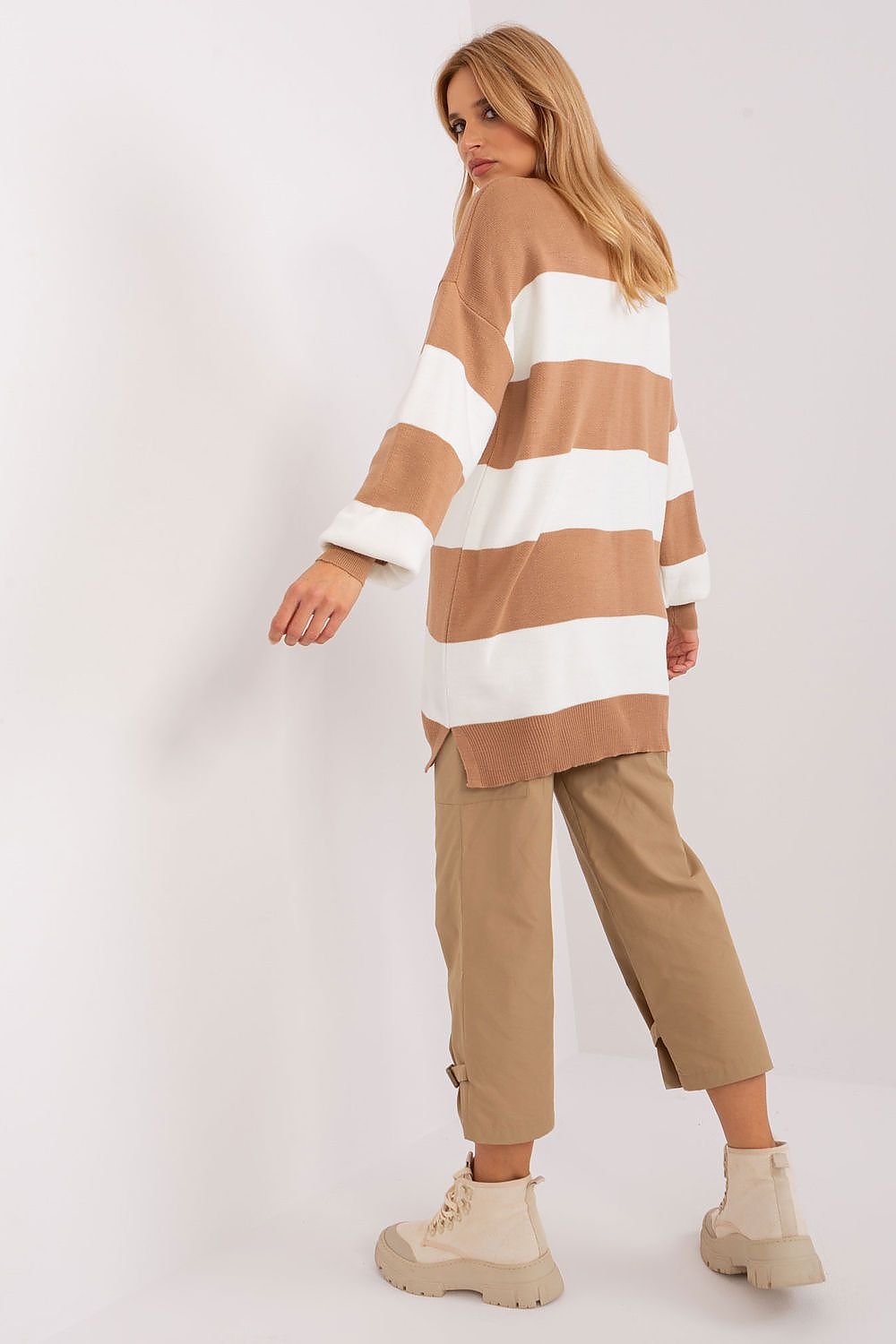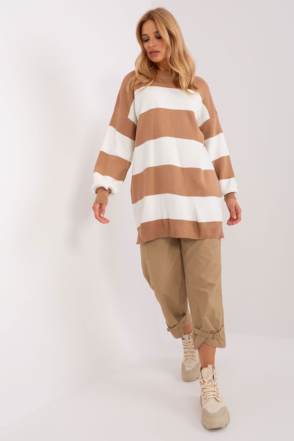This long loose sweater with wide stripes is an ideal option for everyday styling. Made of exceptionally soft and warm material, 100% acrylic, it guarantees comfort and wearability. Its wide stripes give it a unique character and attract attention. The long sleeve and round neckline make it an excellent choice for colder days. It's a sweater that combines comfort and fashionable design, perfect for various occasions.