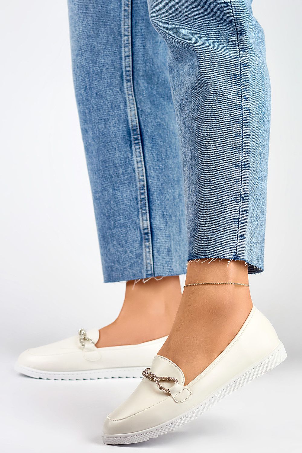 The moccasins in a bright, fresh shade of white are a combination of classic and modern, dedicated to modern women who appreciate both comfort and fashionable looks. The upper made of high-quality eco leather gives the shoes an elegant touch, while emphasizing the sustainable nature of the production. Specifically designed for women, these white moccasins are ideal for warm spring and summer days, but their versatile design means they can be worn all year round, adding lightness to a variety of outfits. The ecological leather insole provides wearing comfort, while adapting to the shape of the foot. These moccasins feature a round nose, which adds a classic touch and makes them easy to match with a variety of clothing. Their slip-on design makes them easy to put on, making them a practical choice for everyday wear. White moccasins are not only elegant footwear, but also an expression of subtle femininity and a stylish approach to fashion.