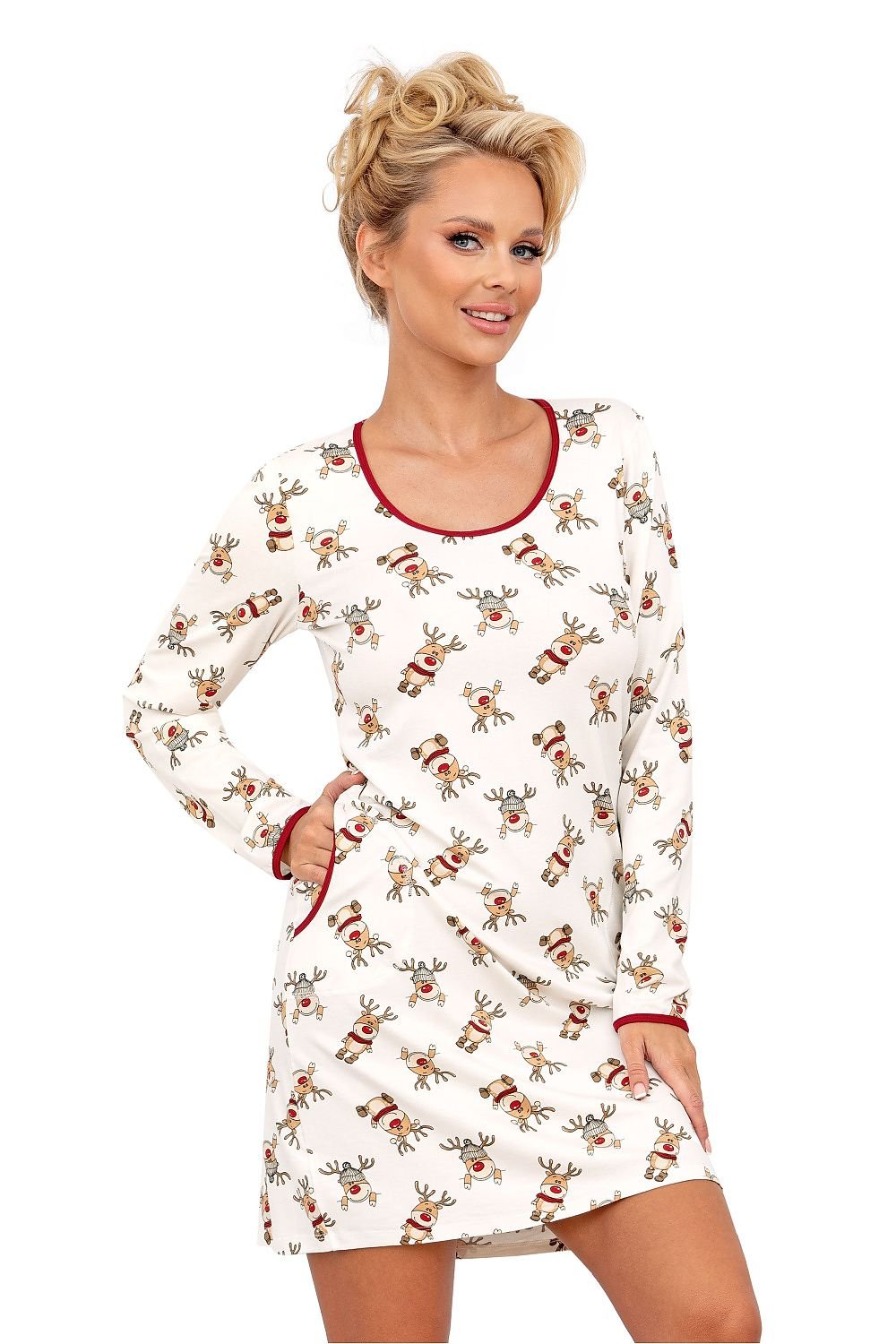 Christmas nightgown with a loose, comfortable cut, perfect for winter nights. The neckline is finished with elegant piping, and the long sleeves provide extra warmth. The reindeer-print fabric brings a charming seasonal atmosphere. The shirt has convenient slip pockets on the sides, which adds to its functionality. Made of soft and airy fabric, pleasant to the skin. Polish product, distinguished by high quality and attention to detail.