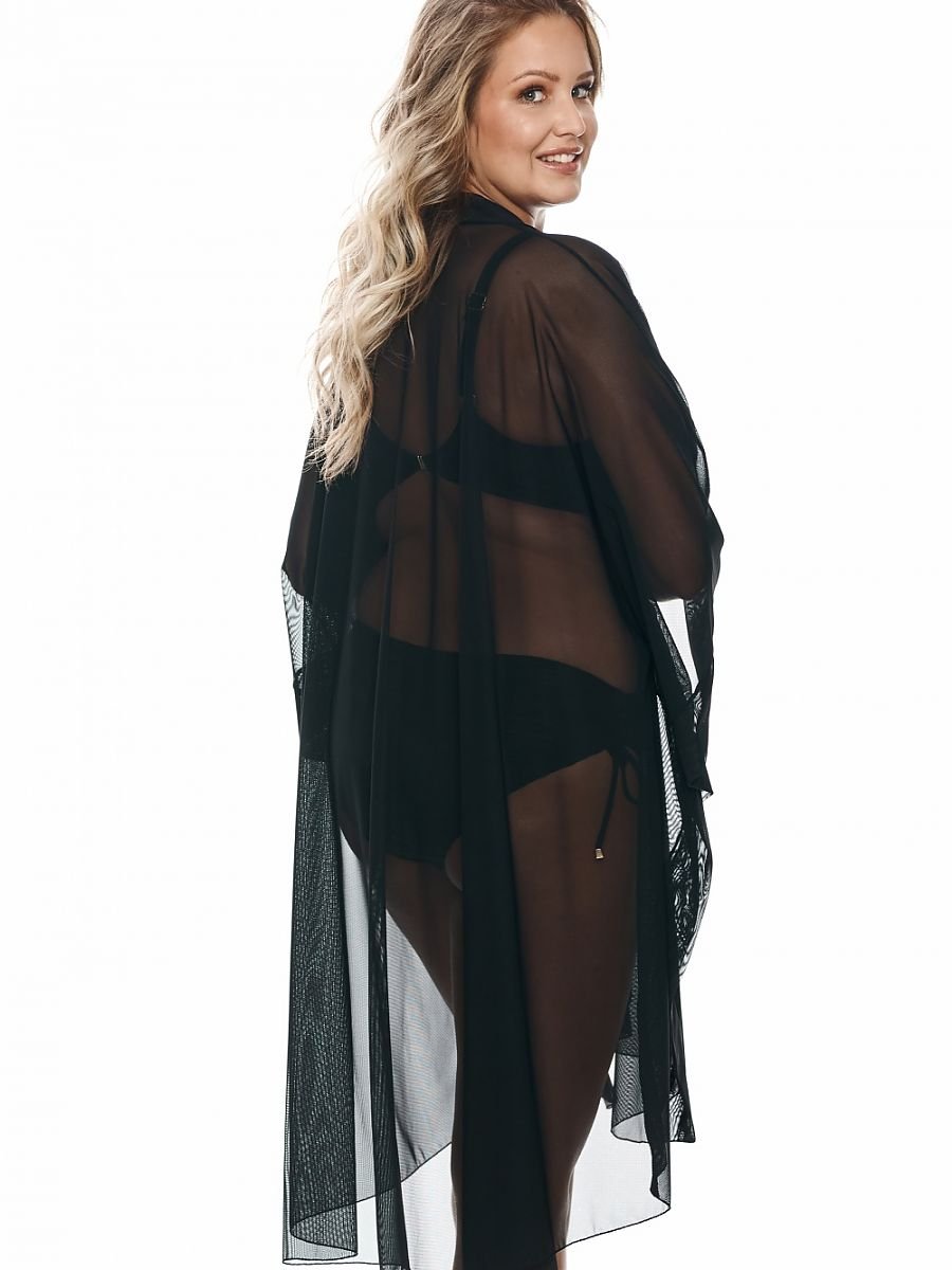 Elegant, airy pareo with longer sleeves made of light, transparent tulle in black color. Its loose-fitting cut and wider kimono sleeves ensure a perfect fit to every figure. It will be a perfect cover up for your beachwear on hot days.