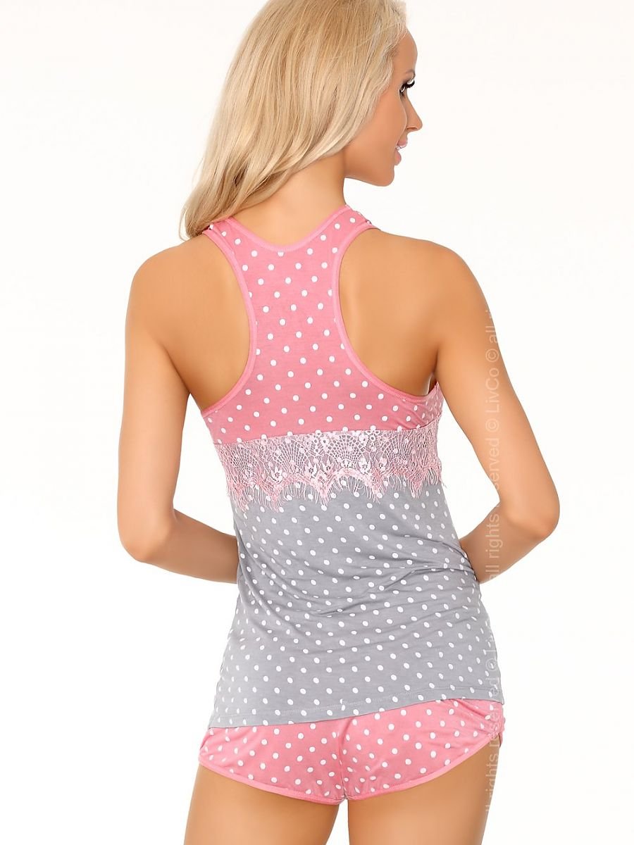 Two-piece dotted pyjamas from the latest Livco collection. Coral-grey, delicate, very comfortable. It will be also useful as a homewear. A boxer blouse with lace decoration at the top and sexy shorts on elastic band finished with small satin bow. Sweet & sexy!