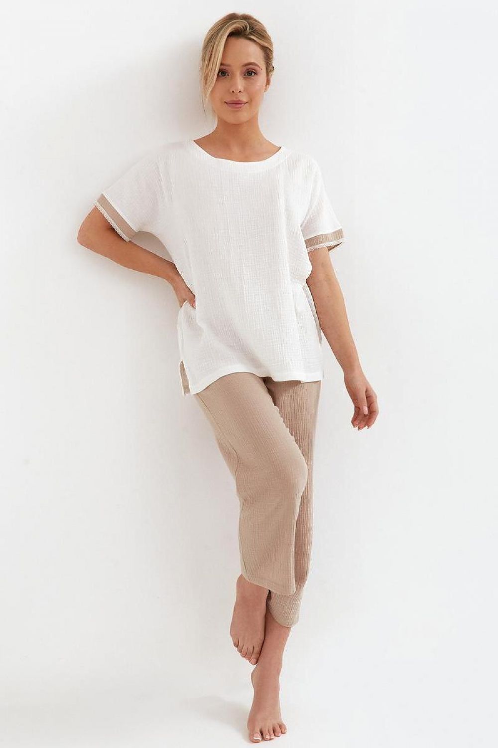 Women's muslin pajamas 230 is a guarantee of comfort and softness for every night. The shirt in a classic cut with a round neckline and short, loose sleeves provides freedom of movement and a feeling of lightness. The sleeves are decorated with an insert in a contrasting color and a delicate lace band, adding subtlety and feminine charm. The pants have a wide calf-length leg, which provides freedom and comfort while sleeping. The waistband features an elastic band and a drawstring, which allows you to adjust the width. The whole garment is made of natural cotton fibers, which provides excellent breathability and softness on the skin, ideal for warm nights. This pajama is a combination of functionality, comfort and elegance, which will make every sleep more pleasant.